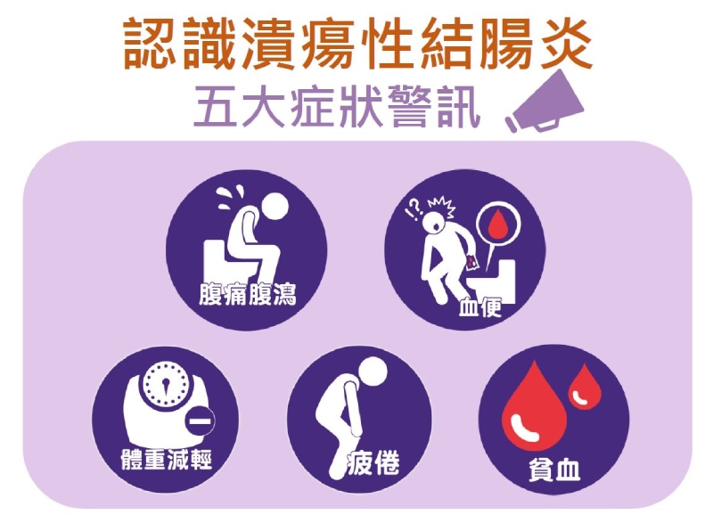 值得注意的是,潰瘍性結腸炎疾病症狀包括持續腹瀉、腹痛、血便、大便解不乾淨感覺等,並不具特異性,與大腸激躁症、感染性腸炎,甚至大腸癌等疾病症狀類似,以致部分患者未能警覺與及時就醫。