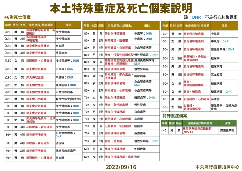 指揮中心指出,今日新增46例本土病例死亡個案,為28例男性、18例女性,年齡介於30多歲至90多歲以上,皆屬重度感染且具慢性病史、27例未接種3劑以上COVID-19疫苗。確診日介於今(2022)年7月20日至9月13日,死亡日期介於9月6日至9月13日,詳如新聞稿附件。