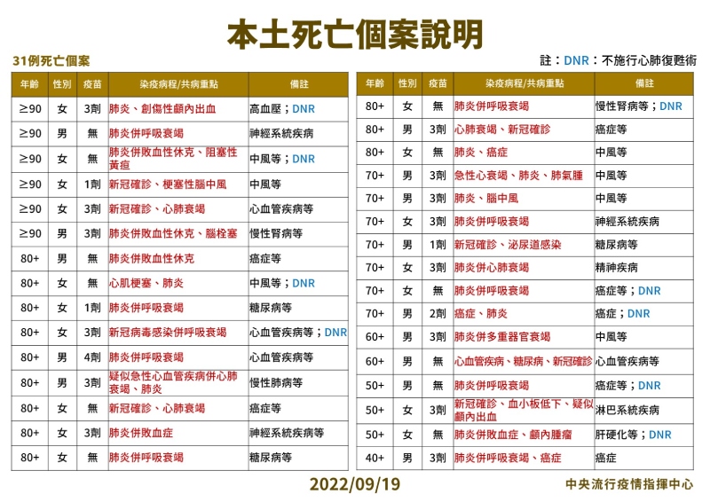 指揮中心指出,今日新增31例本土病例死亡個案,為14例男性、17例女性,年齡介於40多歲至90多歲以上,皆屬重度感染且具慢性病史、16例未接種3劑以上COVID-19疫苗。醫療應變組副組長羅一鈞表示,最年輕的40多歲死亡個案為男性,本身有癌症病史,已接種三劑疫苗,9/1時因出現症狀就醫,PCR為陽性確診,並收住於專責病房,不過因出現肺炎、呼吸衰竭及癌症病況惡化,9/13時於醫院過世。