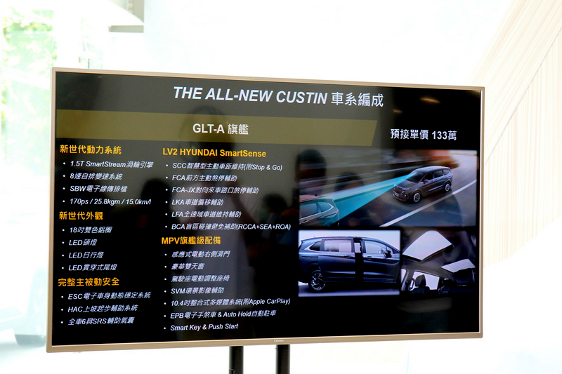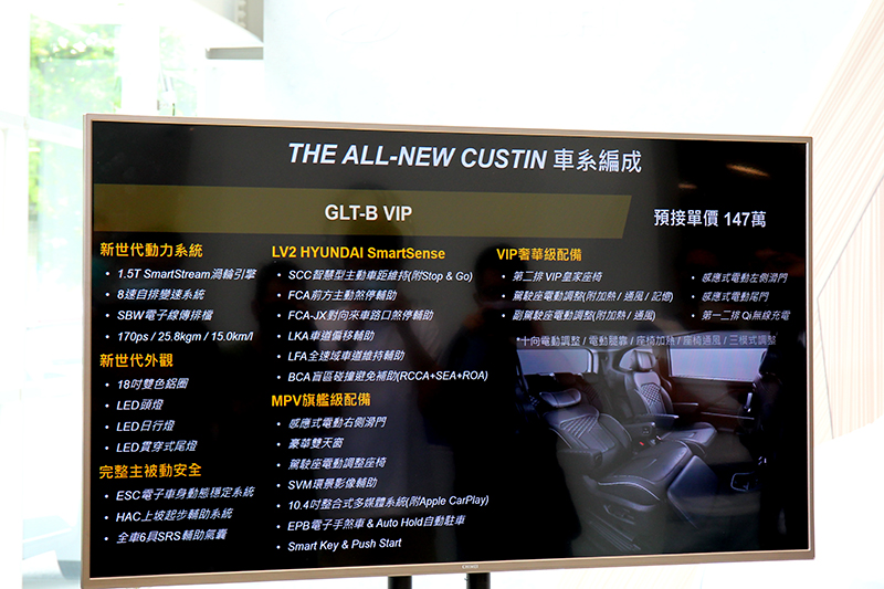 Hyundai Custin七人座MPV將於11月8日上市發表,日前已開放GLT-A預售價133萬元、GLT-B預售價147萬元預接活動,今日(19日)則舉辦媒體預賞活動,活動中也得知目前接單已超過800張。