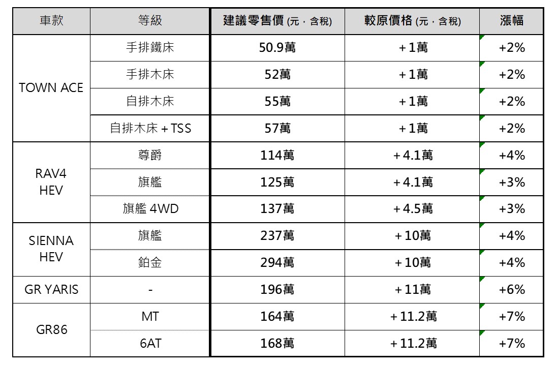 和泰汽車表示今年以來車用原物料成本仍持續上漲,加上全球供應鏈受疫情衝擊造成車用零件短缺,各項造車成本不斷攀升,日本原廠已無法完全吸收,故自 2022/9/20(含)起調整下列車款價格,調漲幅度 2~7%,調整後建議售價如下方表格。