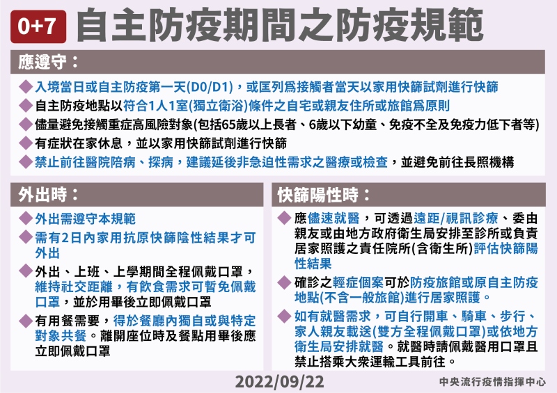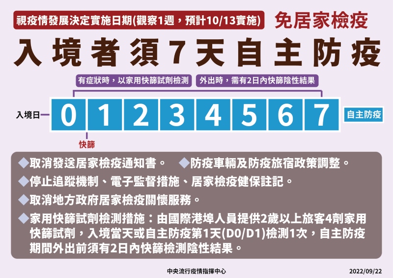發言人莊人翔表示,目前預計於10/13實施「0+7」,不過仍需視疫情發展決定,若確定實施,可免居家檢疫,入境人士只要進行7天的自主防疫,建議入境日的D0與第一天進行快篩,其他日子若出現症狀時,使用家用快篩進行檢測,而外出時,也需要2天內的快篩陰性結果,此外,亦將取消居家檢疫通知書。另,有關防疫車輛,若無症狀的人,可搭乘大眾交通工具,若在機場已有症狀的旅客,就得搭乘防疫車輛,或是由親友開車接送。