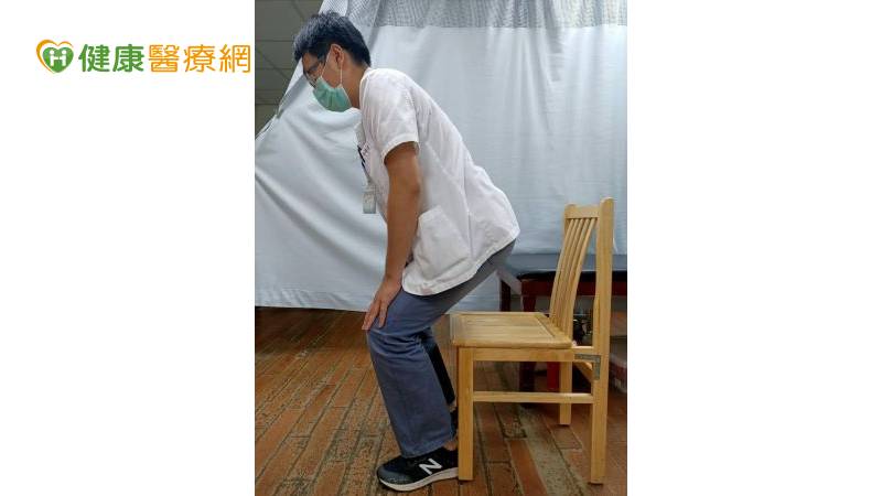 三、從椅子坐站轉換:椅面高度約到膝蓋高度,若是能力不佳者,可選有扶手的椅子可以用手支撐。或是使用助行器協助站立。坐到站,或是站到坐的過程宜緩慢,可感受大腿與臀部用力的感覺與重心位移的變化,加強自身對於身體的本體感覺。每次坐站20下。