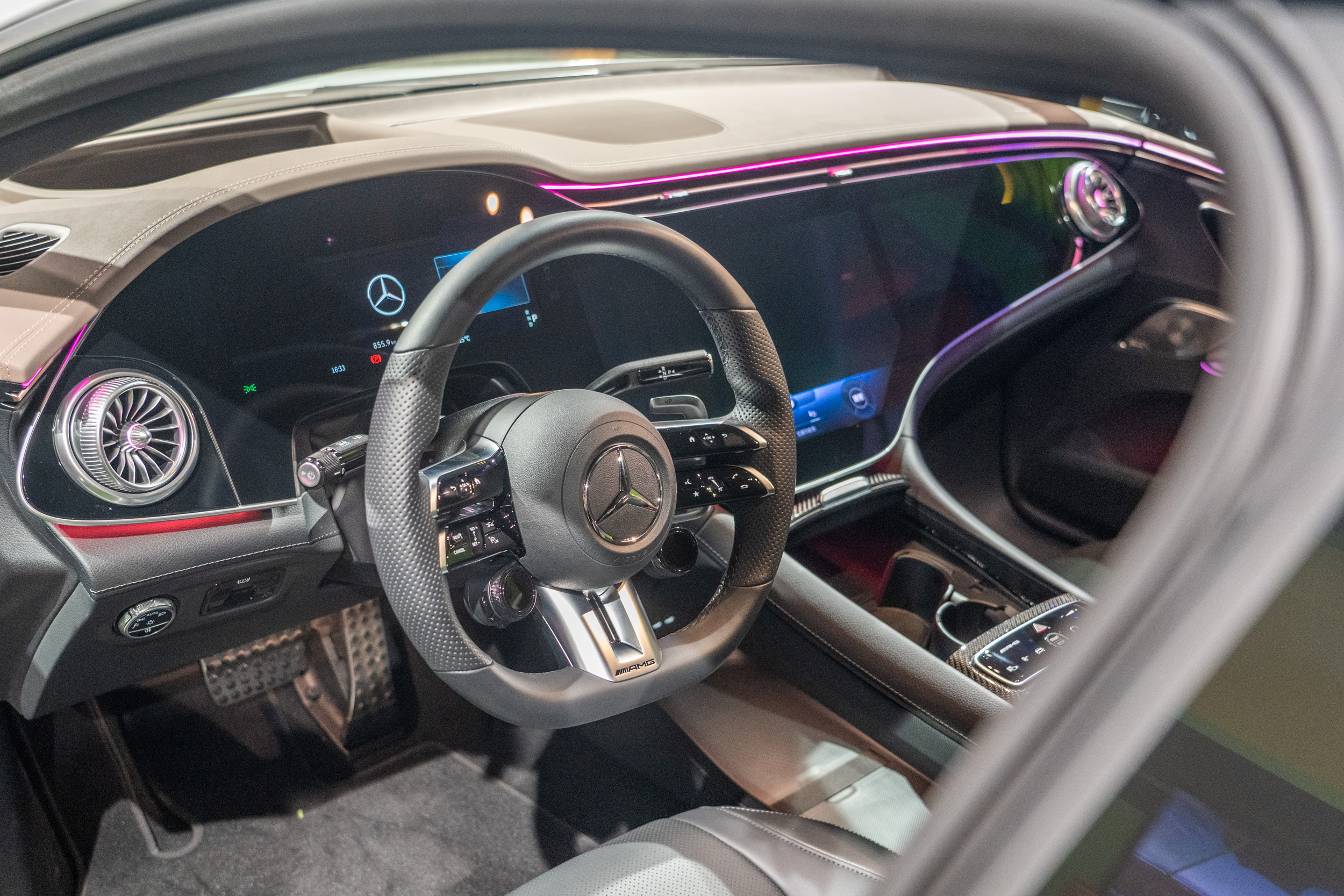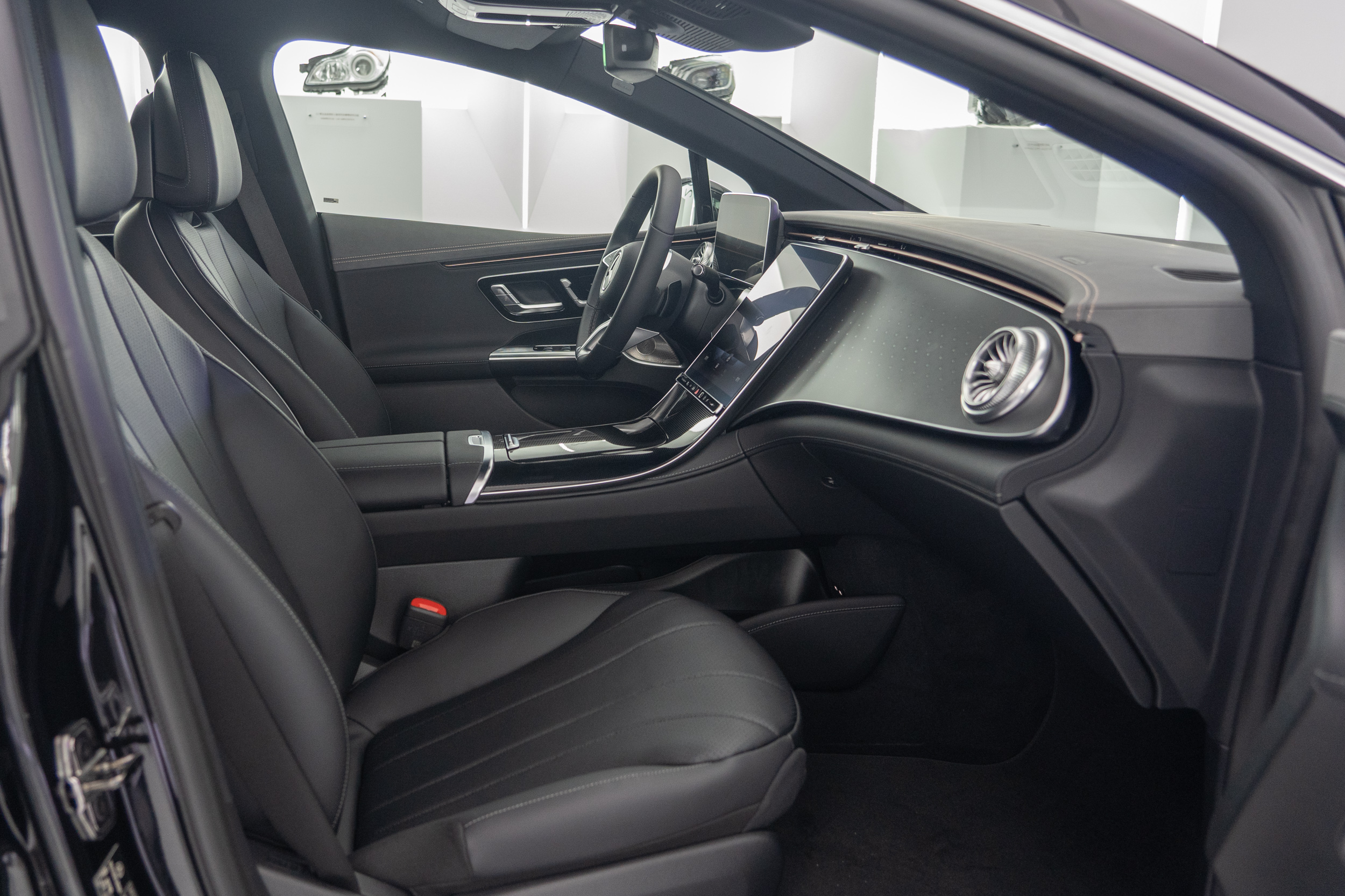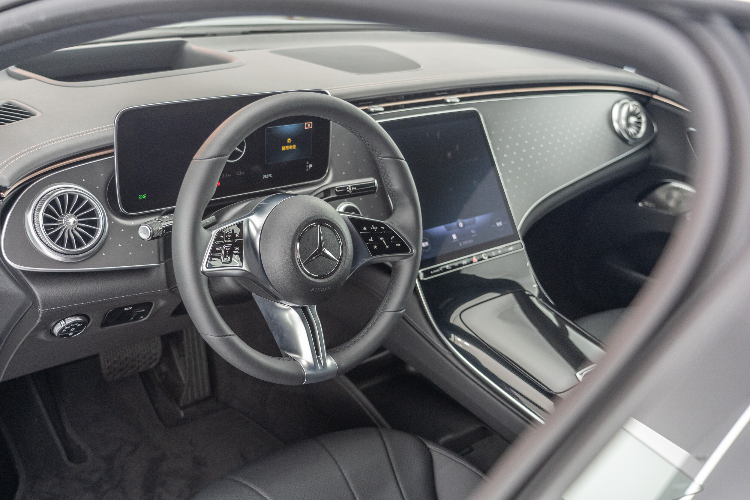 EQE 300 帶來 0.22 Cd 低風阻係數,車頭在大面積亮黑色的「Black Panel」底下隱藏著雷達、攝影機、超聲波等輔助駕駛科技配備,搭配多光束智慧型數位頭燈。內裝在 3,120mm 的軸距設定下,透過駕駛座前移設計,造就寬敞車室空間。科技配備自然是一大亮點,搭載 MBUX 多媒體系統,以更直覺的「擴增實境導航功能」為駕駛快速指引明確的行駛路線。最大角度達 10 度的後軸轉向系統,使迴轉直徑從 12.5 公尺縮減至 10.7 公尺。動力方面,EQE 300 搭載89 kWh 電池及後軸上擁有 245hp 動力輸出的電動馬達,最高達續航里程達 639 公里。