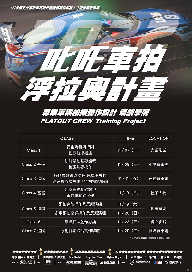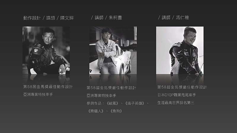 【叱吒車拍】車輛拍攝動作設計培訓學院除了有堅強的師資陣容,更獲得文化部影視及流行音樂產業局、專精特殊拍攝器材的力榮影業,以及專精機車訓練課程之恆典摩托訓練學院的支持與參與。 而隨著影視創作生態的改變以及日新月異的科技進步,動態影片拍攝門檻逐漸降低,許多汽車與機車愛好者也以網路自媒體作為創作平台,在車輛動態影片拍攝過程當中其實隱藏著高危險性,唯有透過正確並有共識的安全觀念才能降低風險,在《叱吒風雲》電影當中有許多刺激的高速賽車鏡頭,其實是透過精確的鏡頭設計,並輔以正確的輔助器材才得以完成,不論是飛車特技亦或者是高速對決,甚至是甩尾飄移都是在所有人員絕對安全並受監控的狀態下進行,而在這當中所有環節的工作人員彼此即時通暢地溝通成為了最重要的一件事。