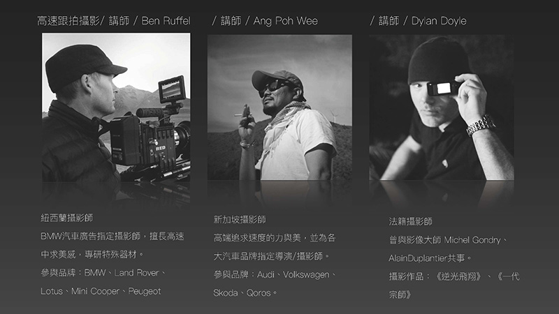 台灣設備最齊全的專業輔助器材廠商力榮影業,將支援千萬級高速跟拍設備與車輛。 另一方面,動態攝影指導如何理解並運用各種車輛拍攝的輔助器材,將更能拍攝出更具力量與創意的新穎畫面,培訓學院課程與台灣設備最齊全的專業輔助器材廠商力榮影業合作,讓所有熱愛車輛拍攝的創作者都能體驗千萬級高速跟拍設備,同時透過換位思考的駕駛體驗課程,更能掌握車手執行動作的難易度以及可能發生的隱藏風險,除了共從創作激盪出更多創意火花,更重要的是利用各種器材來達成安全攝影的目標。現場更邀請到《叱吒風雲》演員范逸臣 柯有倫 一同分享拍攝經歷。