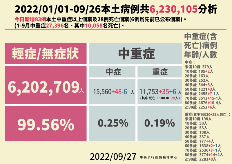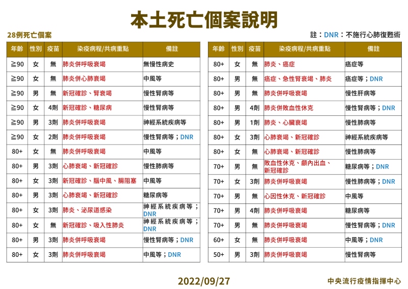 指揮中心指出,今日新增28例本土病例死亡個案,為14例男性、14例女性,年齡介於50多歲至90多歲以上,皆屬重度感染、27例具慢性病史、15例未接種3劑以上COVID-19疫苗。確診日介於今(2022)年9月4日至9月23日,死亡日期介於9月14日至9月24日,詳如新聞稿附件。