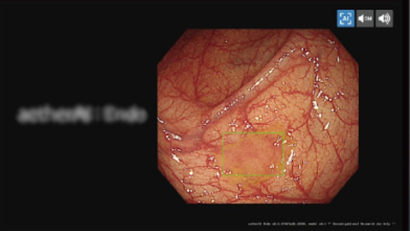 ▲「即時大腸鏡瘜肉自動偵測」能即時自動偵測大腸鏡瘜肉,將病灶位置清楚框選出,並有聲音警示。