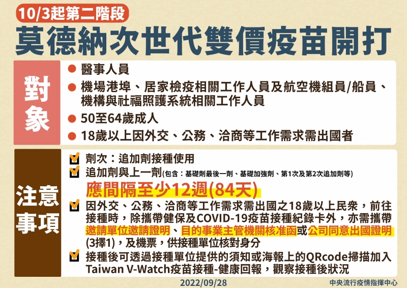 【健康醫療網/記者楊艾庭報導】中央流行疫情指揮中心今(28)日表示,因應Omicron變異株影響及邊境逐步開放後可能之疫情衝擊,為儘速提升民眾抵抗Omicron變異株之免疫保護力,自今(2022)年10月3日起,開放第二階段對象追加接種Moderna次世代雙價疫苗,且與最後一劑基礎劑/基礎追加劑或前一劑追加劑應間隔至少12週(84天)。