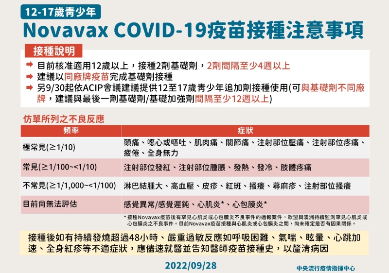 臺大醫院李秉穎醫師說明,Novavax和以前國內所有的mRNA、腺病毒疫苗不同,是屬於基因重組蛋白疫苗,目前用於12歲以上、接種兩劑基礎劑,兩劑至少間隔4週以上,我們建議同廠牌疫苗完成基礎劑接種。李秉穎進一步說明,「12-17歲青少年接種mRNA疫苗時,有些人會出現嚴重不良反應,包括心肌炎,若曾出現這些情形,即可接種作用機制不一樣的蛋白疫苗Novavax作為基礎劑、基礎加強劑的接種。」基礎加強劑和第二劑的至少間隔12週以上。