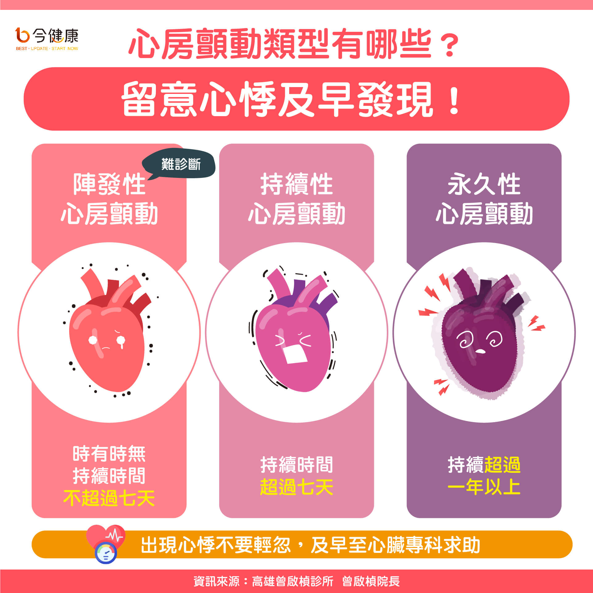 其中永久性的心房顫動,大多數病患可能習以為常反而疏忽警訊,但是醫師相對容易診斷;曾啟楨院長指出,相反的,陣發性或是持續性心房顫動,雖然症狀明顯,但是發作時間短,就醫時經常不能立即揪出是心房顫動在作怪。因此醫師與病人,還是得留意相關症狀,出現心悸絕對不要輕忽,務必及早請心臟專科醫師協助。