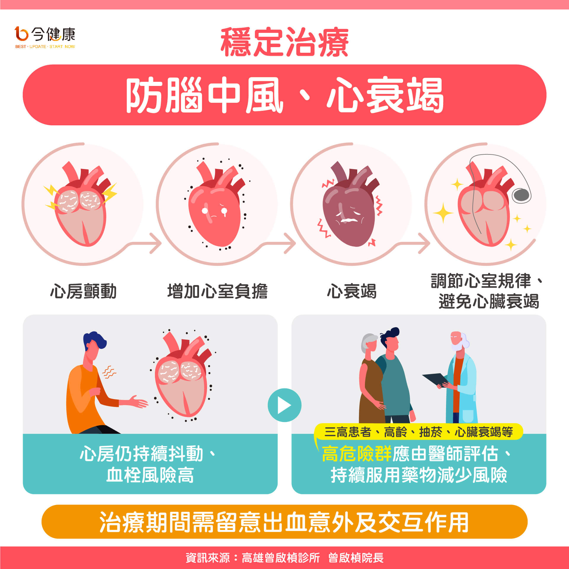曾院長表示目前心房顫動治療應由醫師診斷後,依照各人不同風險,制定客製化的治療。可以藉由調節心跳速度(心速)或控制心跳規律性(心律),以減少心臟衰竭,並預防腦中風: