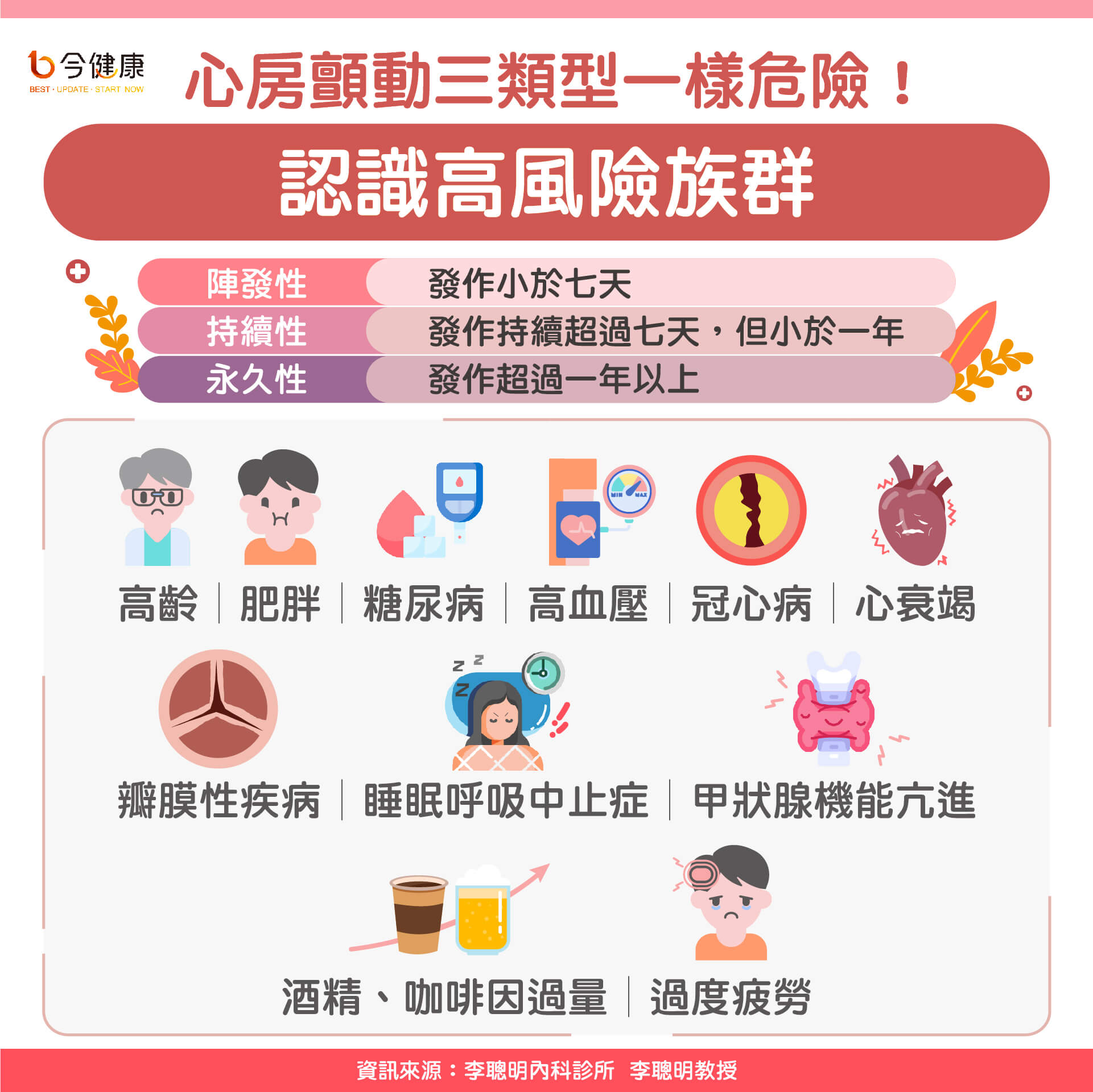 心房顫動除了容易發生在年紀較大的族群,其他像是肥胖、高血壓、心衰竭、糖尿病、甲狀腺機能亢進等病人,也是心房顫動好發族群。因為心臟不規則跳動,血液無法順利流動,導致患者可能會胸悶、心悸,嚴重甚至會有腦中風的威脅。但也有部分患者完全沒有症狀,可能在看診或心電圖檢查才意外發現心房顫動。李聰明內科診所李聰明教授建議,民眾自身若為高風險族群務必及早揪出心房顫動,並認識急性腦中風的正確處置FAST,才是正確護心關鍵!