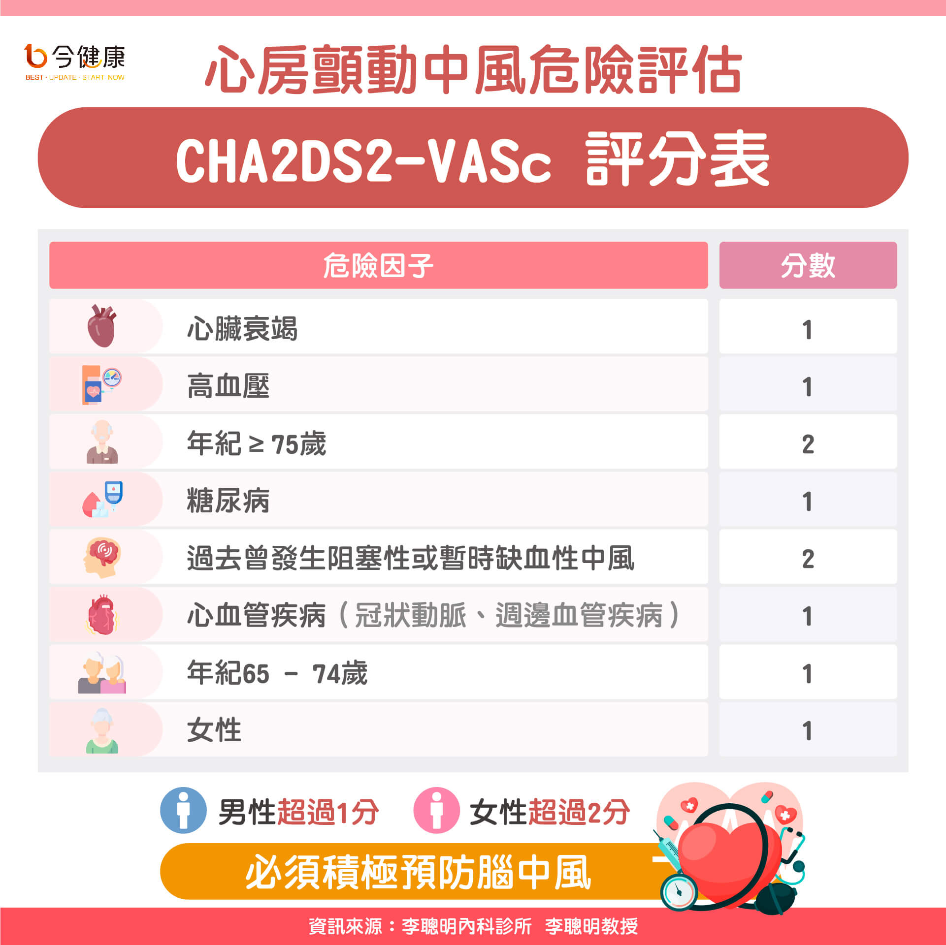 每個心房顫動患者中風的風險都不相同,李聰明教授一般會使用CHA2DS2-VASc評分表評估,當危險因子越多、分數越高,中風的風險就越高,越需要積極預防中風。尤其台灣心房顫動發生中風的風險是常人約8至10倍,死亡率和殘障度也相當高,務必積極配合醫師治療。