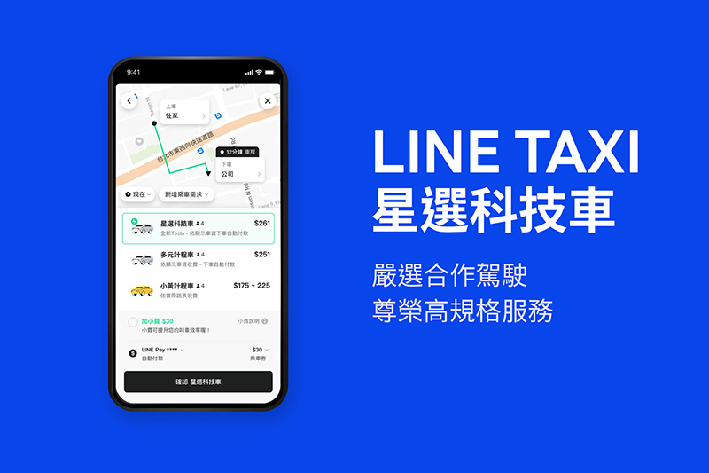 Line Taxi持續關注市場趨勢與用戶需求,經訪談與數據觀察發現,92% 用戶期待期待再次搭到電動車,且高達99% 用戶期待能在行程中獲得貼心的服務體驗。為回應乘客心聲,Line Taxi宣布推出全新服務選項「Line Taxi星選科技車」,將優先採用電動車作為主要服務車款,首波40台電動車皆為Tesla,車內將提供瓶裝水、消毒酒精、充電插座等物品服務,並且每一位司機都經過審核後,再由Line聘請之專業形象顧問團隊,為「星選科技車」駕駛量身打造禮賓培訓,以提供最尊榮地服務品質;而在提升服務的同時,「Line Taxi星選科技車」定價僅是一般計程車的1.2倍,平均多花一杯飲料的價錢,就可以體驗商務艙等級的尊榮服務。Line Taxi星選科技車將於10月21日正式上線,首波服務範圍將以雙北為主。