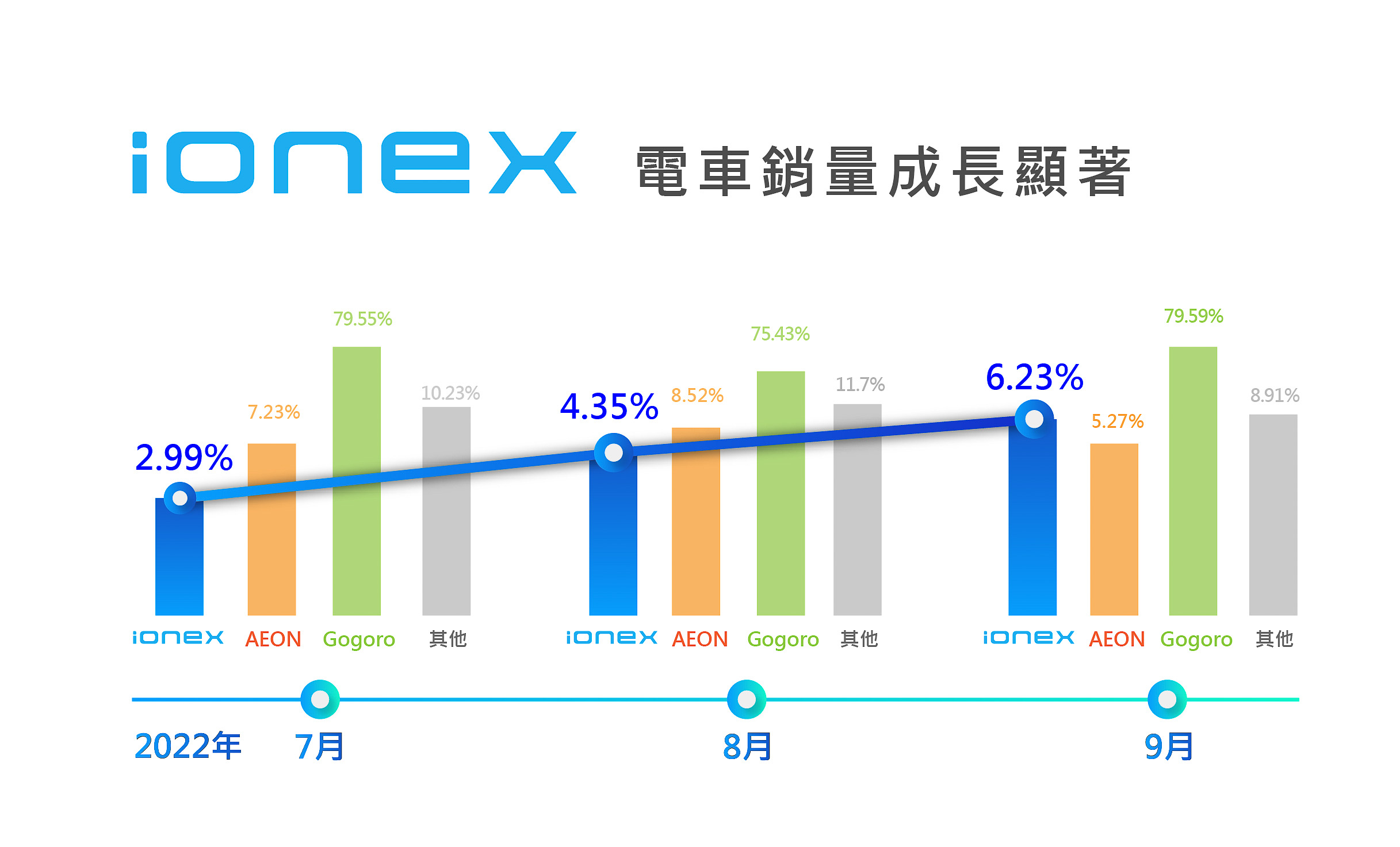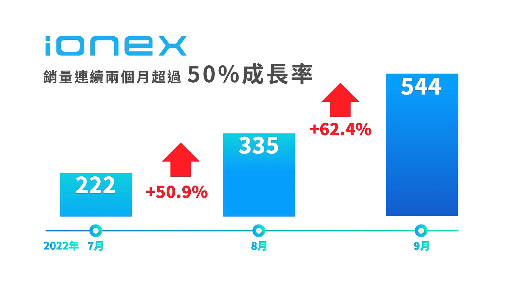 相較於七月銷售台數222台,Ionex電動車八月份銷量提升至335台,成長超過1.5倍;九月份銷量更是倍數成長至544台,與八月相比增加209台,成長幅度達到62.4%,Ionex光陽電動車成功贏得年度最大購車旺季九月單月市占亞軍,改變了PBGN在電動機車市場獨占鰲頭的情況,在2022年電動機車銷售中,五月份及九月份的市占累計兩次獲得了第二名的好成績!同時,Ionex也透過「百萬學霸」及「百萬父豪」購車抽百萬現金活動成功製造話題,後續陸續推出的暢銷車款Ionex i-One創白牌電動機車最低價33,300元,成功引起搶購熱潮,全台貨量銷售一空;性能車系S7只要55,500元起,也創下銷售佳績追加生產中。除針對熱銷車款推出購車優惠,與知名美式賣場Costco的特惠展售更是神助攻,專案內容一公布,來自好市多全台14間的門市訂單便紛紛湧入,一舉推升Ionex銷量締造亮眼佳績。