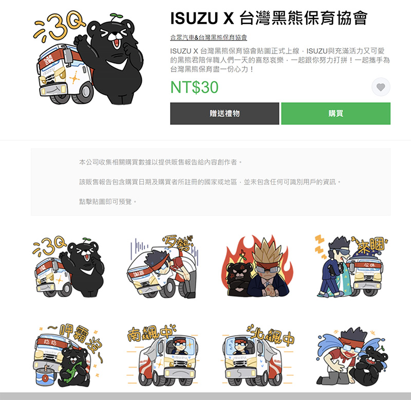而「護熊職人號」保育巡迴車只是雙方合作的第一步。Isuzu台北合眾汽車更宣布,與台灣黑熊協會聯名推出的LINE貼圖,即日起正式上線,誓言讓熊厲害的Isuzu與充滿活力又可愛的黑熊君,一起成為保育台灣黑熊的最佳代言人。秉持Isuzu台北合眾汽車取之於社會、用之於社會的經營理念,貼圖的所得將全數捐贈台灣黑熊協會,一起為台灣生態保育盡一份力。
