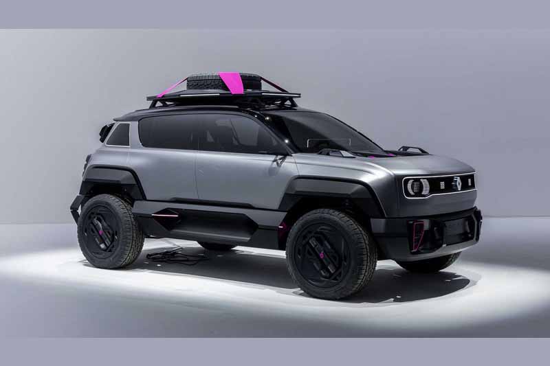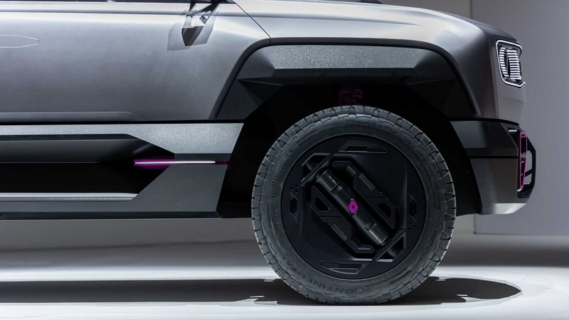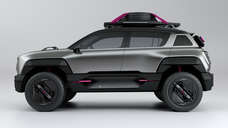 但為了增添整體的越野感受,除了加高底盤使其距地高度達200mm,輪圈中央還採用內置氣壓彈簧的特殊設計,同時換上更為粗曠的保桿造型,車頂則安裝有碳纖維車頂架及備胎,在後窗位置另外備有一把鐵鏟,車底則為了保護電池模組亦作了強化處裡,搭配全車槍色金屬銀的漆料塗裝,視覺效果帶有強烈的未來感受。