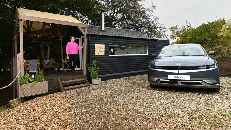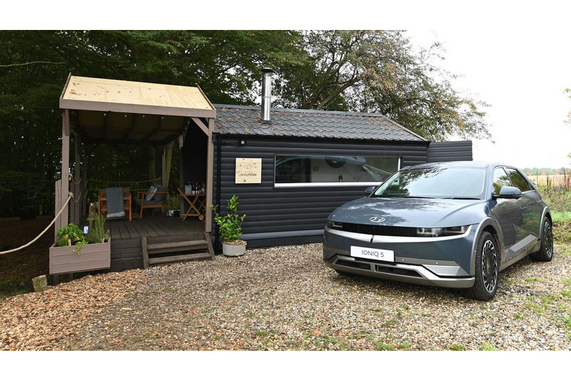 Hyundai為了證明Ioniq 5的電力足敷一間小木屋使用,特地舉辦了一場比賽選出14位參賽者透過Ioniq 5的儲備電力來維持屋內所有電器設備的電力消耗,活動地點選在英國東部的艾塞克斯郡,這是一處濱海並充滿豐富自然生態的鄉鎮,在此Hyundai打造了一間結合木質材料與玻璃牆面的雙人小屋,內部配備包含有暖氣、投影機、音響等常見的電器設備,而電力來源便是來自戶外的Ioniq 5。