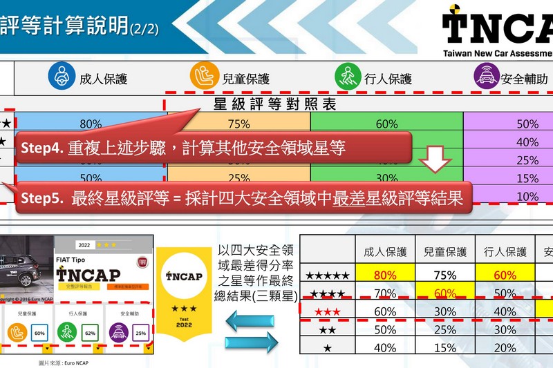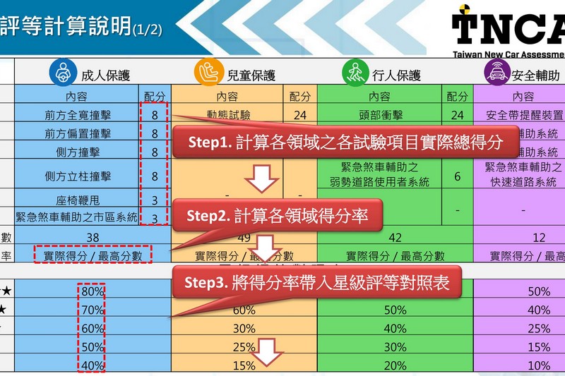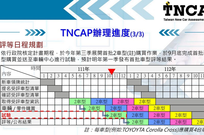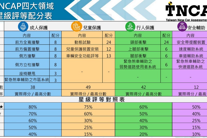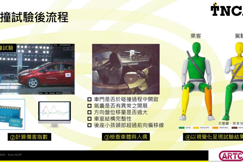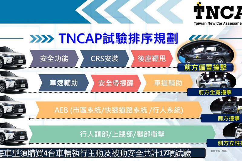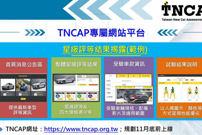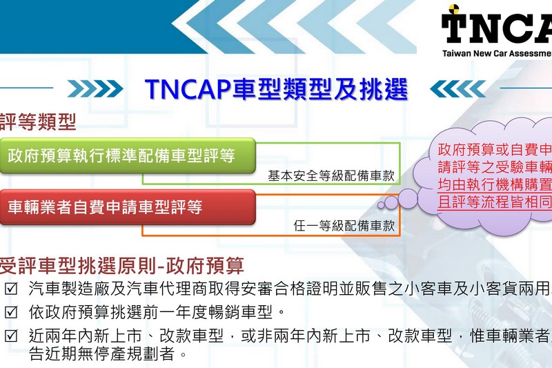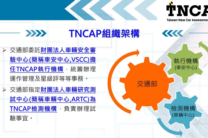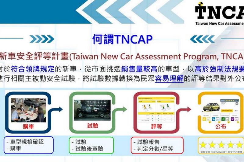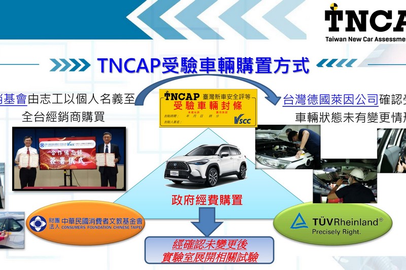 車安中心說明,依行政院核定「臺灣新車安全評等計畫(107-112年)」,交通部委託熟悉國內外車輛安全法規與國際NCAP相關制度及協助建立TNCAP規章之車安中心擔任TNCAP執行機構,統籌辦理運作管理及星級評等等事務,以及指定車輛中心為TNCAP檢測機構,負責辦理受驗車輛主動及被動安全等17項試驗。此外,車安中心為確保TNCAP制度之客觀及公正性,委請中華民國消費者文教基金會派員以一般消費者身分至經銷商展售據點以政府經費購車,並請台灣德國萊因公司確認車輛無變更情形,再交付車輛中心實驗室進行試驗,最終由車安中心將試驗數據轉換為民眾容易理解的星級評等結果並對外公布。