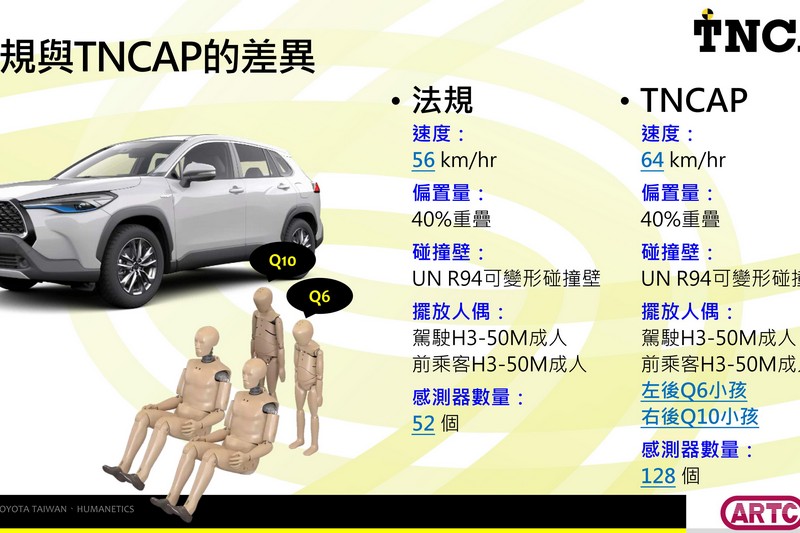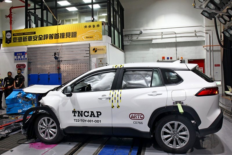 車安中心表示,我國自87年起實施強制性的車輛型式安全審驗制度,確保車輛具備最基本安全性,而TNCAP則有別於強制性車輛法規制度,係在市面上購買小客車(含客貨兩用車),並以更嚴格的標準進行試驗,因此今(10/27)日首撞之受驗車輛是挑選去(110)年全年銷售量排名第一的Toyota Corolla Cross車型進行前方偏置撞擊試驗,後續將依TNCAP規章執行完整試驗工作。