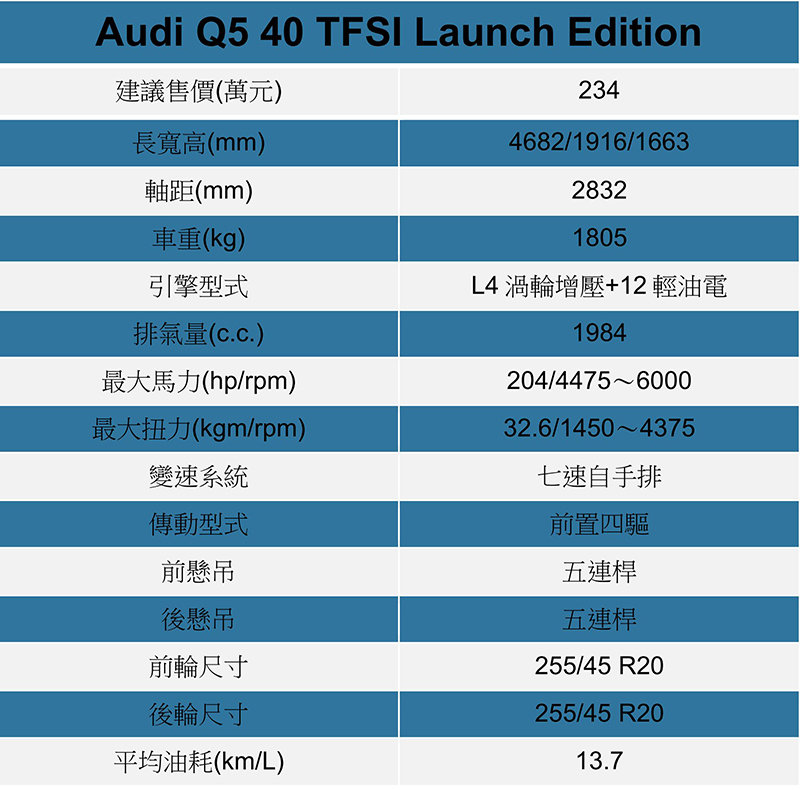 quattro ultra四輪驅動系統讓Q5在彎中有著安定的表現。 看完是不是應該知道要怎麼選?若我會選Q5 40 TFSI Launch Edition,首先以休旅車定位來說204hp動力已相當足夠,再來配備也幾乎相同,除非你真的想要全景天窗、電動腰靠、運動化懸吊,最後重點就是Q5 40 TFSI Launch Edition售價234萬元,與40 TFSI quattro advanced進化版和45 TFSI quattro S line運動版,有11萬和63萬元價差。