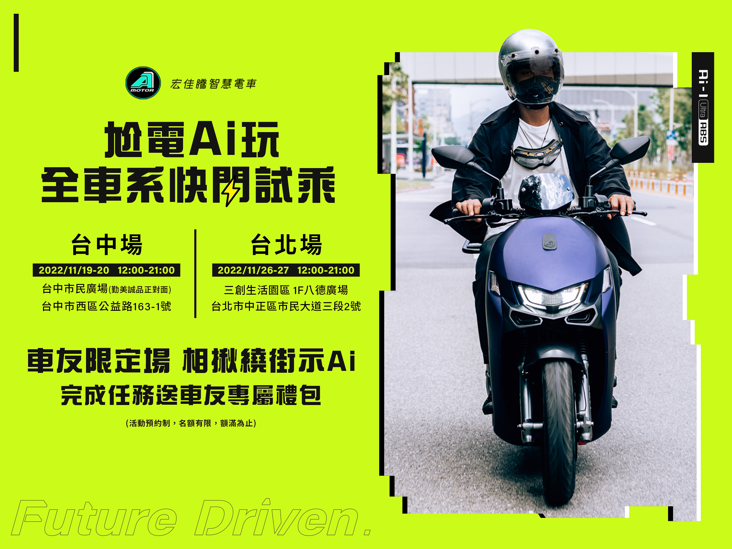為提供有興趣的消費者最完整的Ai玩試乘體驗,宏佳騰智慧電車分別於11月19、20日在台中市民廣場;11月26、27日在三創生活園區舉辦「尬電Ai玩 全車系快閃試乘」活動,要讓台中與台北的朋友將全車系車款一次騎個夠,完成體驗任務就能獲得品牌限量好禮(數量有限,送完為止),再抽都會風雨衣、MOTO A1 藍牙耳機、品牌風格安全帽等大禮,現場更有Ai玩專屬打卡點,並提供拍立得服務,讓前來體驗的民眾留下美好紀錄。