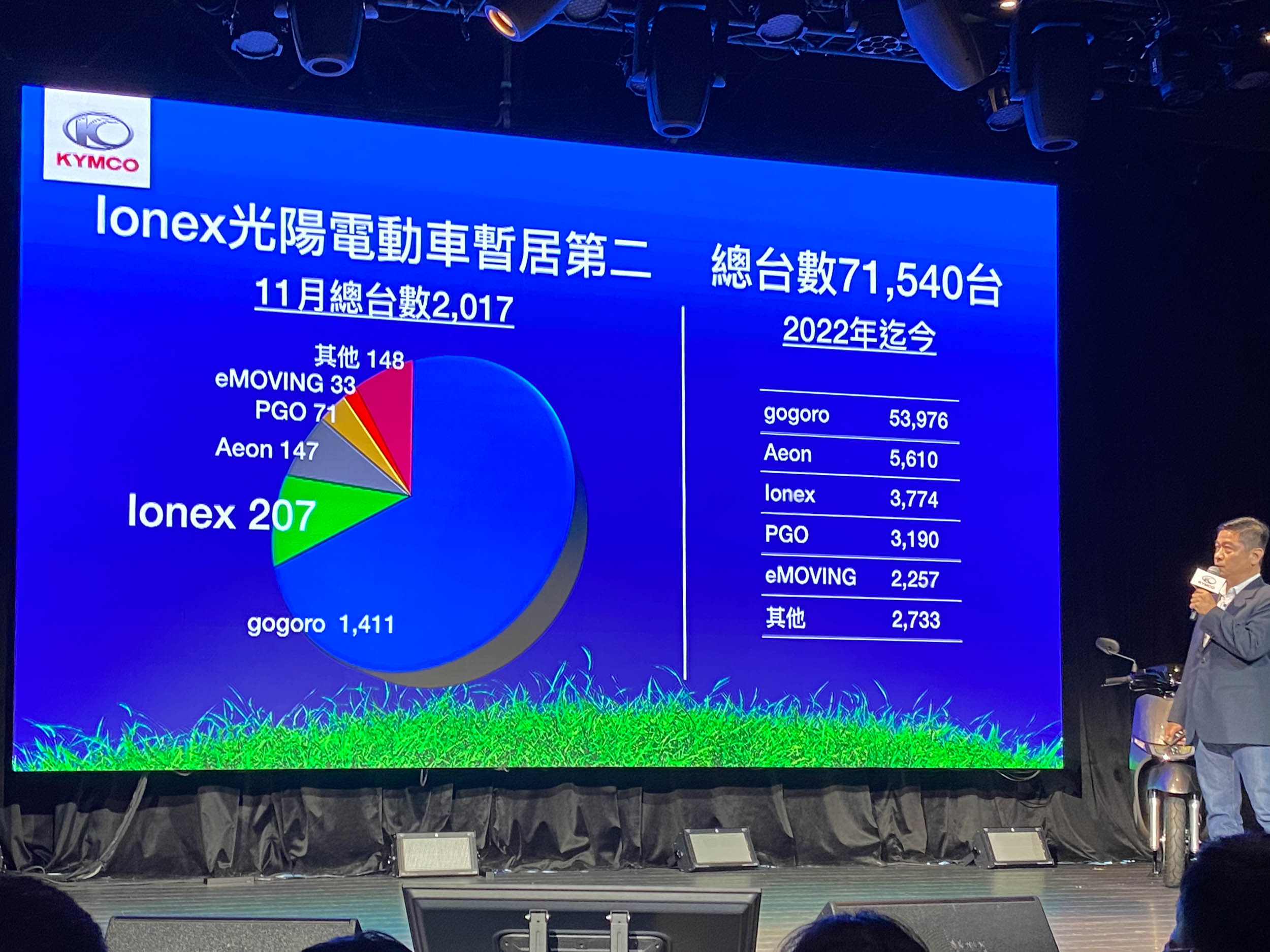 以環境友好日為主題,KYMCO 也於記者會分享 2022 年截至目前為止的銷售表現,以整體市場而論,目前燃油機車+電動機車總銷售台數為 617,570 輛,其中燃油機車以 546,032 輛佔比 88%。身為燃油機車主力戰場的 125c.c. 級距,2022 年市場銷售規模約莫 34 萬輛,KYMCO 旗下兩大戰將 GP 125 與 Like 125 分別以 35,066輛 與 9,651 輛銷售量有著重要佔比。以電動車而言,2022 年迄今 Ionex 目前以 3,774 輛的累積銷售輛暫居第三,其中 11 月單月銷售表現衝至 2,017 輛,單月暫居第二。此外,KYMCO 也藉由記者會上同時宣布,Ionex 將於 2023 年陸續外銷歐洲市場,包含英、法、瑞、義總計 12 個市場都將在明年看到 Ionex 在當地銷售、道路上騎乘的風景。