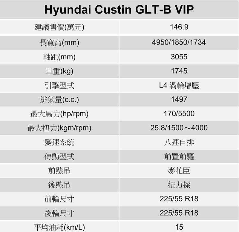 滿座情況下也有一定置物空間。 MPV設定、車長4,950mm的Custin,其中GLT-B VIP車型車重有1,745公斤,若是滿載情況其車重肯定突破2噸,相信不少消費者會有動力不足重拖疑慮。對此Hyundai替Custin準備一具1.5升渦輪引擎,在渦輪增壓助益下可繳出170hp最大馬力,25.8kgm扭力峰值更於1,500rpm便全數輸出,及創造15km/L平均油耗。搭配八速自排變速系統,實際駕駛不僅沒有慢半拍或重拖,甚至稍稍加深油門深度還能感受到一股帶有衝勁的加速力道。然而若想要更進一步獲得更多能量和更敏捷的反應,Custin也有提供Sport模式,另外也有ECO、Comfort與Smart模式來提供不同的行駛風格。