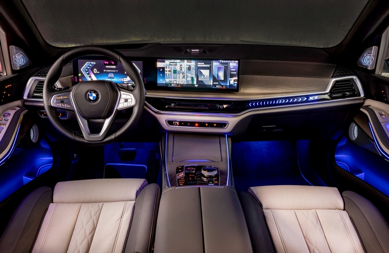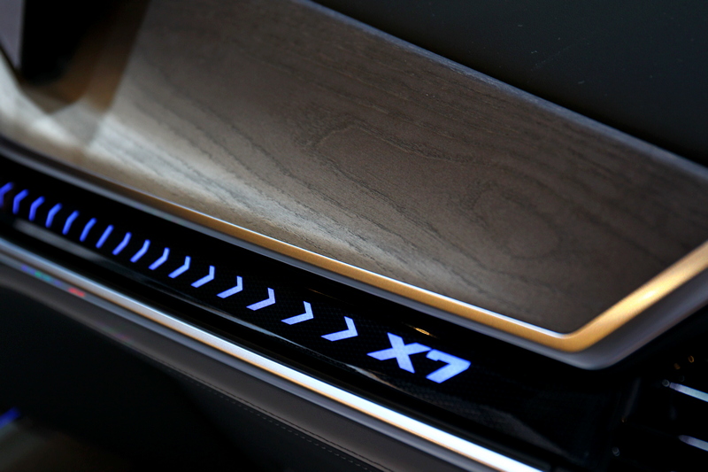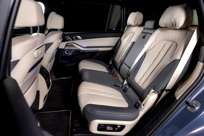 立足於領航世代前進的頂尖科技,X7為眾人獻上宛如頭等艙級的愜意空間,透過長達3,105mm的軸距表現,提供七人乘坐的寬敞舒適空間,第二排座椅具備電動椅背可調與最高可達14.5cm的電動前後滑移功能,在後排座椅全數傾倒的狀態下能創造出高達2,120L的行李廂空間,偕同全景式電動玻璃天窗、旅行便利套件、上下對開電動尾門啟閉系統、車門自動緊閉系統,不僅為X7舖陳出舒適寬敞的座艙布局,最大輸出可達1,475瓦且擁有20具揚聲器的Bowers & Wilkins鑽石高傳真音響系統與可讓第二排與第三排車室獨立調整座艙溫度的豪華型五區恆溫空調,更讓X7的全車乘員都能享受絕佳的音樂饗宴、自由選擇最舒適的座艙溫度。X7透過諸多細節堆疊出座艙的細膩與溫度,導入可提供最多15種色彩選擇的全新X7專屬環艙氣氛燈、BMW Individual Fine-Wood淺色梣木紋飾板、BMW Individual Merino頂級真皮材質、雙前座舒適型電動座椅含記憶功能、跑車多功能真皮方向盤(含換檔撥片)、頂級水晶中控套件與全新設計的排檔操作介面,大幅釋放了座艙內中央鞍座區域的空間,並為X7帶來尊爵不凡的層峰細膩質感。