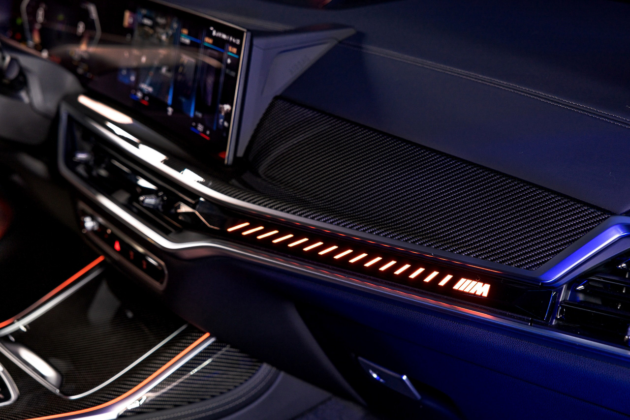 全新X7 M60i xDrive以豪華為基石,為座艙增添更多熱情與性能氣息,標配的六人座設定不僅透過後排獨立雙座帶來更顯尊榮的乘車體驗,座艙內配置的雙前座M跑車座椅含記憶功能、M多功能真皮方向盤搭配專屬縫線、M碳纖維飾板、M圖樣環艙氣氛燈、M縫線安全帶與BMW Individual Alcantara麂皮黑色車內頂篷,搭配Sky Lounge全景式電動玻璃天窗,透過鑲嵌於其中的15,000顆LED光源,營造出有如滿天繁星的迷人樣貌,為X7 M60i xDrive的尊貴車室氣息增添更多熱血氛圍的同時,更打造出神祕且令人靈魂躍動的頂級座艙。