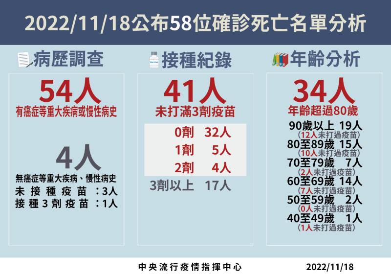指揮中心指出,今日新增58例本土病例死亡個案,為32例男性、26例女性,年齡介於40多歲至90多歲以上,皆屬重度感染、54例具慢性病史、41例未接種3劑以上COVID-19疫苗。指揮中心醫療應變組副組長羅一鈞表示,其中有32位沒有接種過任何一劑疫苗,人數超過一半左右。