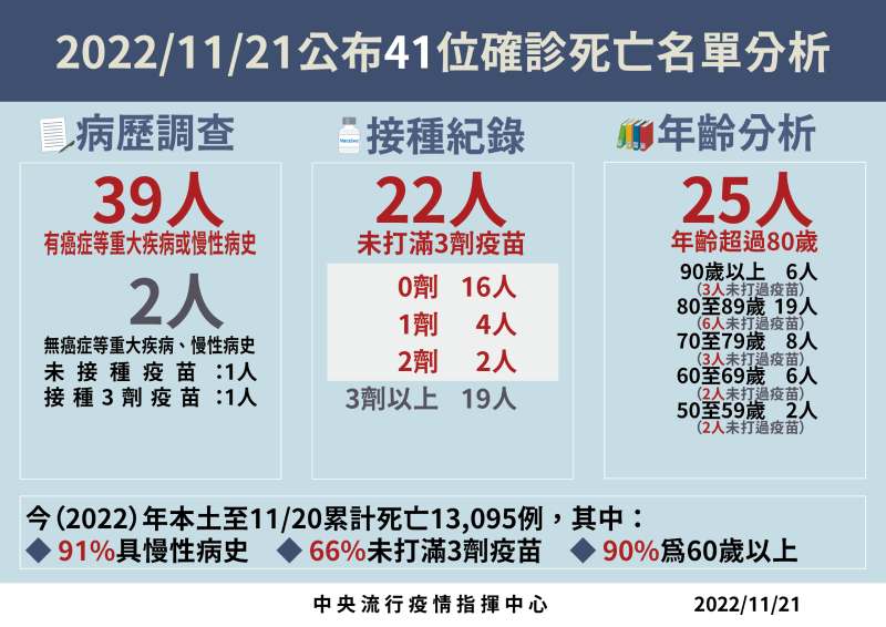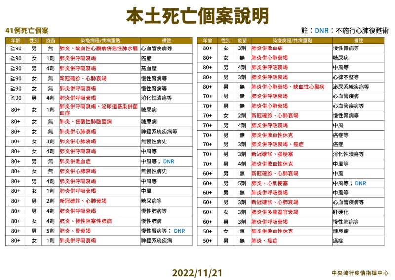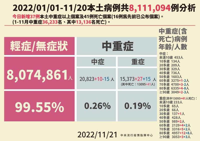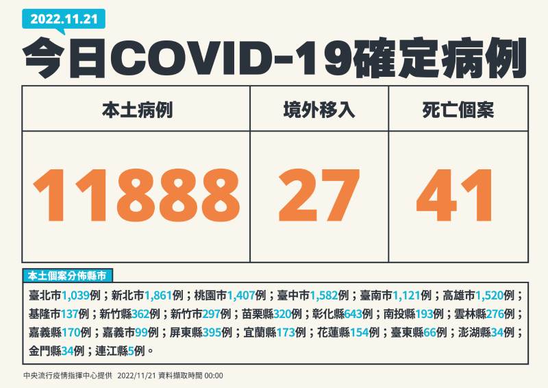 指揮中心表示,今日新增之11,888例本土病例,為5,512例男性、6,372例女性、4例調查中,年齡介於未滿5歲至90多歲以上。今日新增41例本土病例死亡個案,為24例男性、17例女性,年齡介於50多歲至90多歲以上,皆屬重度感染,有39例有慢性病史,22例未接種3劑以上COVID-19疫苗,其中有16位一劑都沒有接種。
