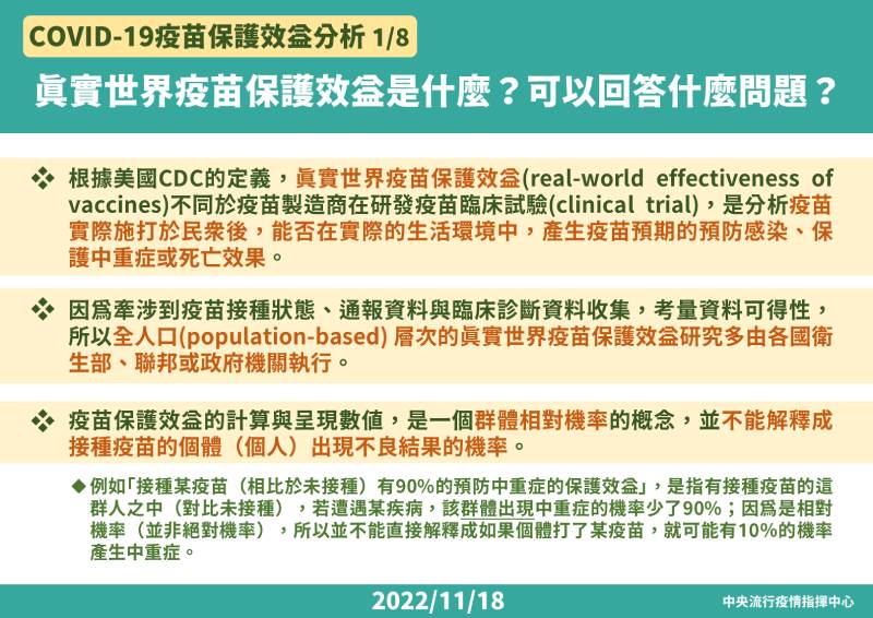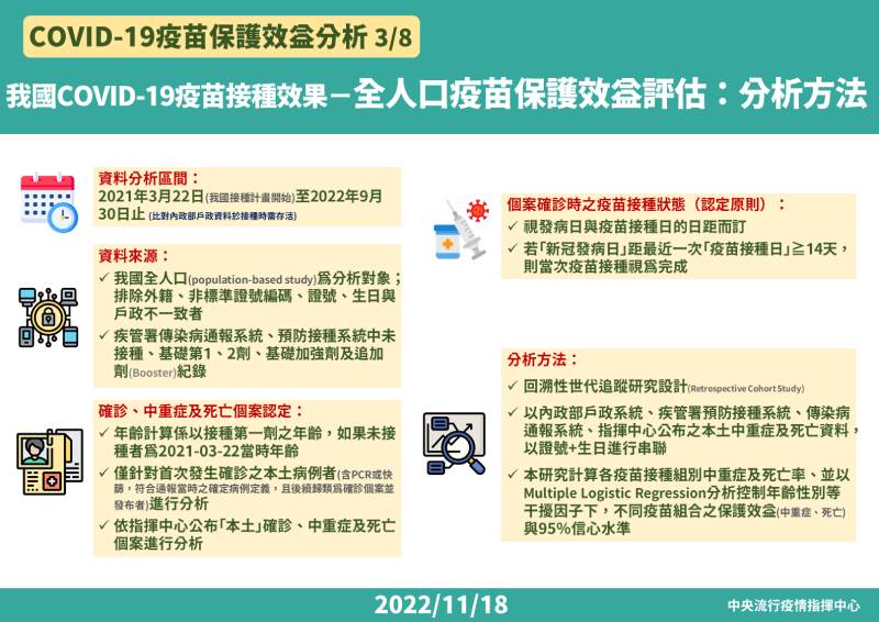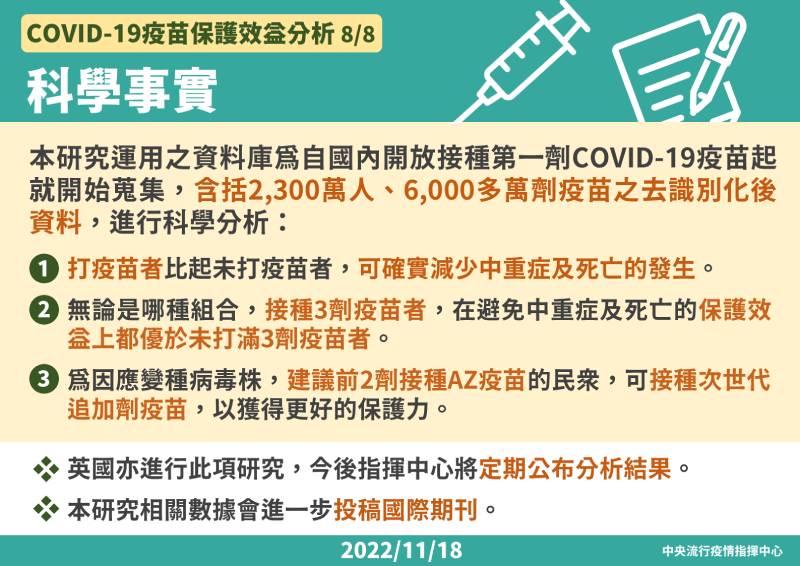 指揮中心發言人莊人祥表示,從去年3月22日開始收集資料,是因為這天國內開始接種第一劑AZ疫苗,而資料收集到今年9月30日,是因為9月下旬開始有次世代疫苗接種,指揮中心希望在這期間先來了解國內單價疫苗接種保護效益。