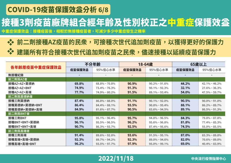 此外,指揮中心也分析了AZ、莫德納、BNT、高端不同的組合,在中重症、死亡的保護效力如何。不分年齡層來看,「2劑AZ+莫德納」的保護效力最低,中重症保護效益為69.8%,死亡保護效益為61.1%。而整體看起來,前兩劑打AZ的民眾不論第三劑打什麼廠牌的疫苗,其保護力都比前2劑打高端、莫德納、BNT疫苗的民眾低。莊人祥表示,目前變異株持續流行,疫苗保護效力事實上也會隨著時間慢慢降低,建議「前兩劑施打AZ疫苗」的民眾,應接種次世代追加劑疫苗,以獲得更好的保護力。