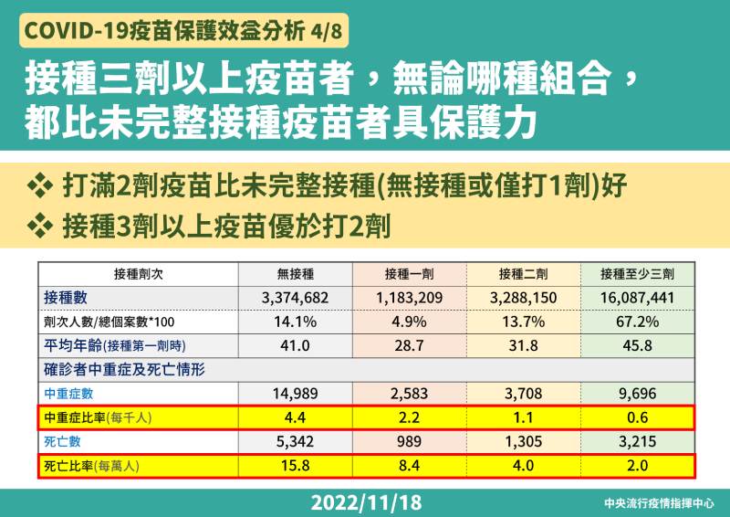 根據指揮中心公布的資料顯示,國內大概有67%民眾至少接種3劑疫苗,一劑都沒接種的民眾約佔14.1%。這些沒接種的民眾後來發生中重症的比率為每千人分之4.4;接種一劑疫苗的中重症發生比率為每千人分之2.2;接種兩劑的發生比率為每千人分之1.1;接種三劑為每千人分之0.6。莊人祥表示,從資料中可以看到每接種一劑疫苗,中重症發生率就減少大約2倍,而這樣的情形在死亡發生率上也是一樣。