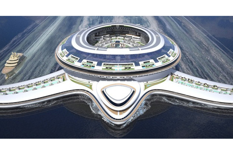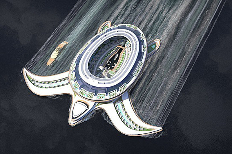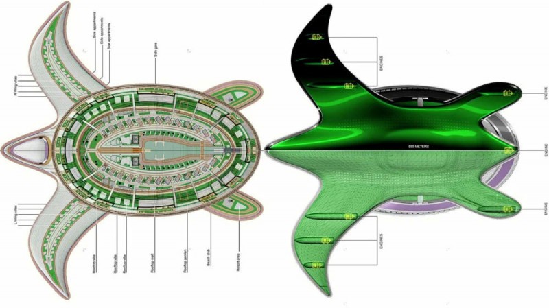 而如此巨大的船身,幾乎可以把一座小城鎮給移植上去,內部將有酒店、購物中心、俱樂部、公園、港口、垂直起降機場等,甚至還有獨棟別墅,共可容納多達60,000人在龜殼與前肢結構內。