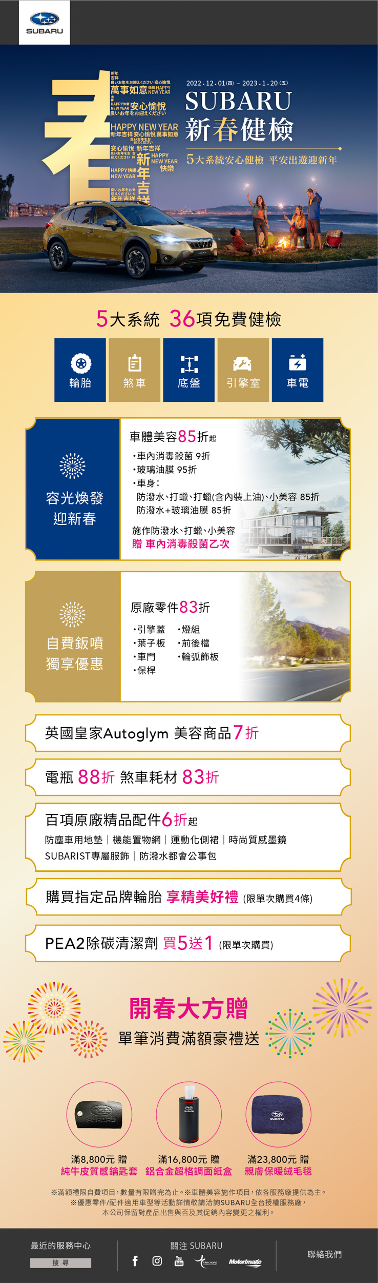 歲末年終迎新之際,為了讓您的愛車以最佳狀態迎接嶄新的2023年,SUBARU特別推出「SUBARU新春健檢」活動,自2022年12月1日起至2023年1月20日止,凡於活動期間預約返廠,不僅提供全車五大系統共36項免費健檢,更享有精緻車體美容與原廠零配件專屬優惠,單筆消費滿額再贈豪禮。SUBARU期盼以最專業、用心的服務,讓每一位車主享受安心與愉悅的精彩旅程。