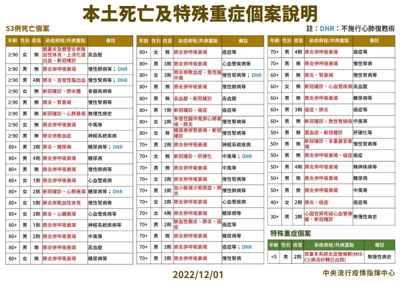 今日新增53例本土病例死亡個案,為35例男性、18例女性,年齡介於30多歲至90多歲以上,皆屬重度感染、51例具慢性病史、37例未接種3劑以上COVID-19疫苗。