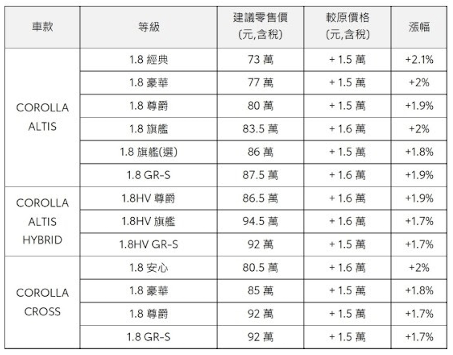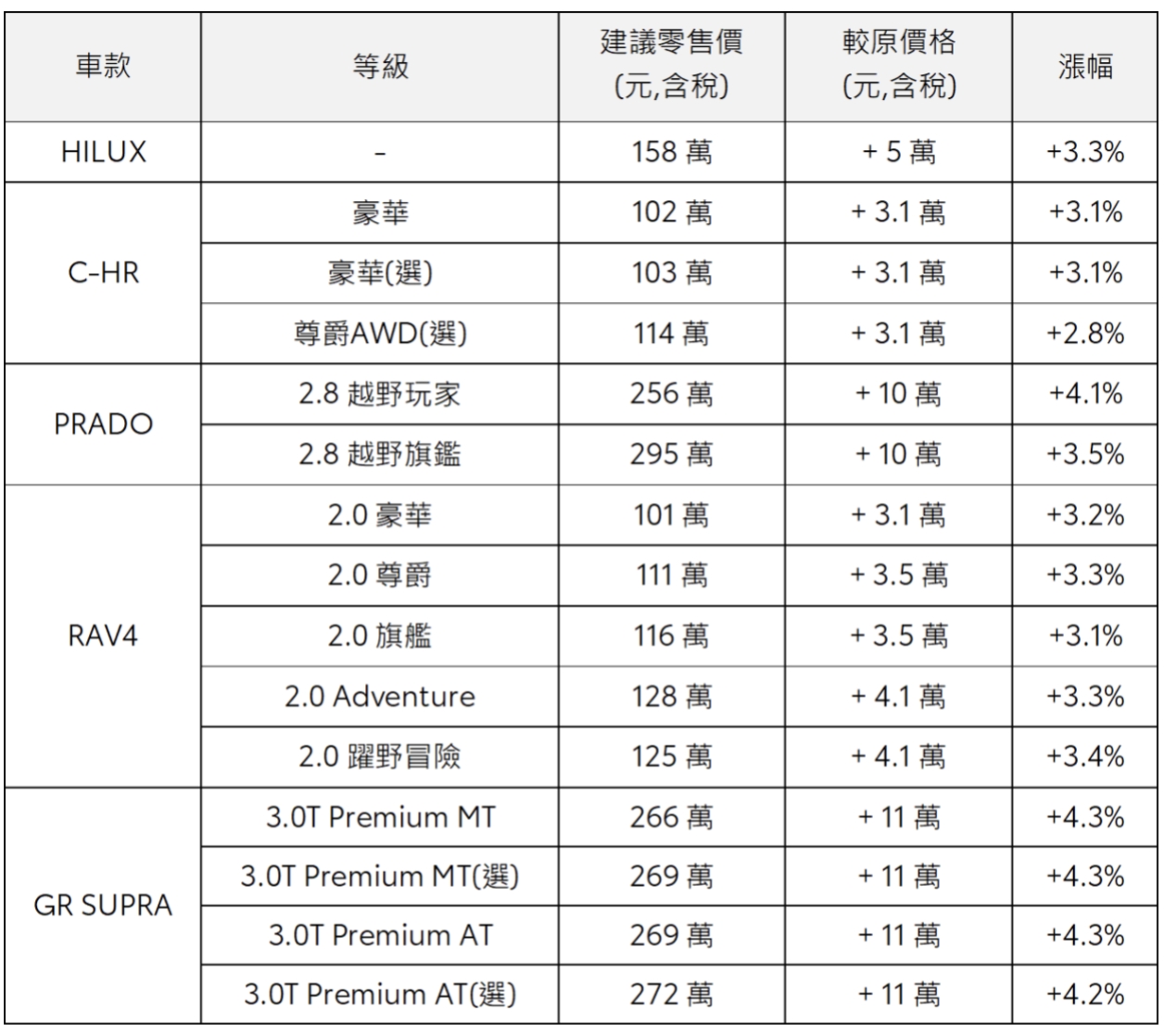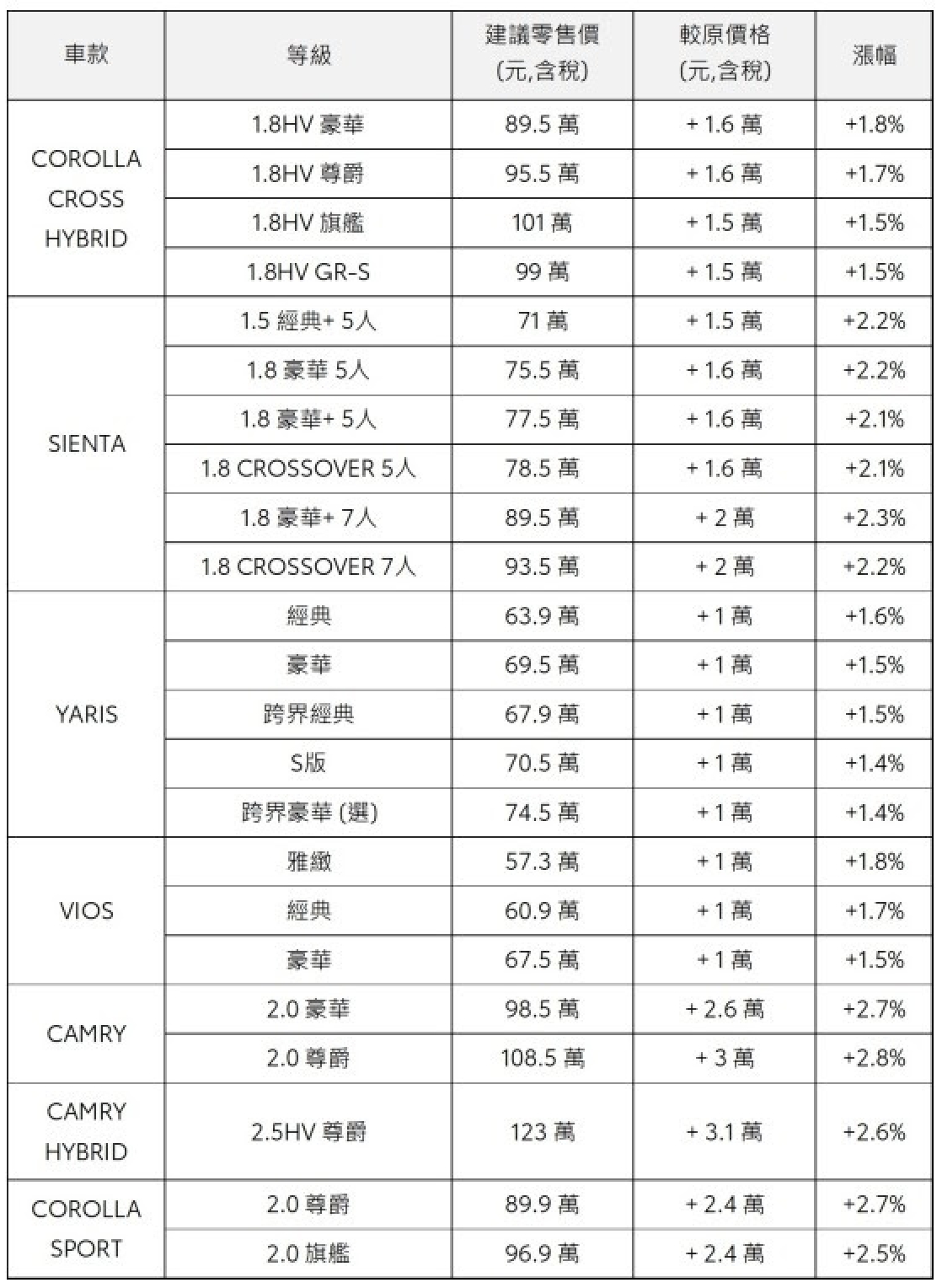 今年以來,車用原物料不僅缺料嚴重,且鋼材、晶片、電池等重要零組件價格仍持續上漲,再加上人力、運輸物流等費用堆疊之下,使得造車成本大幅攀升。和泰汽車表示,日本原廠已無法完全吸收多重變數及壓力,故調整下列車款自2023/1/1(含)起生產之價格,平均漲幅為2%,調整後建議售價如下表: