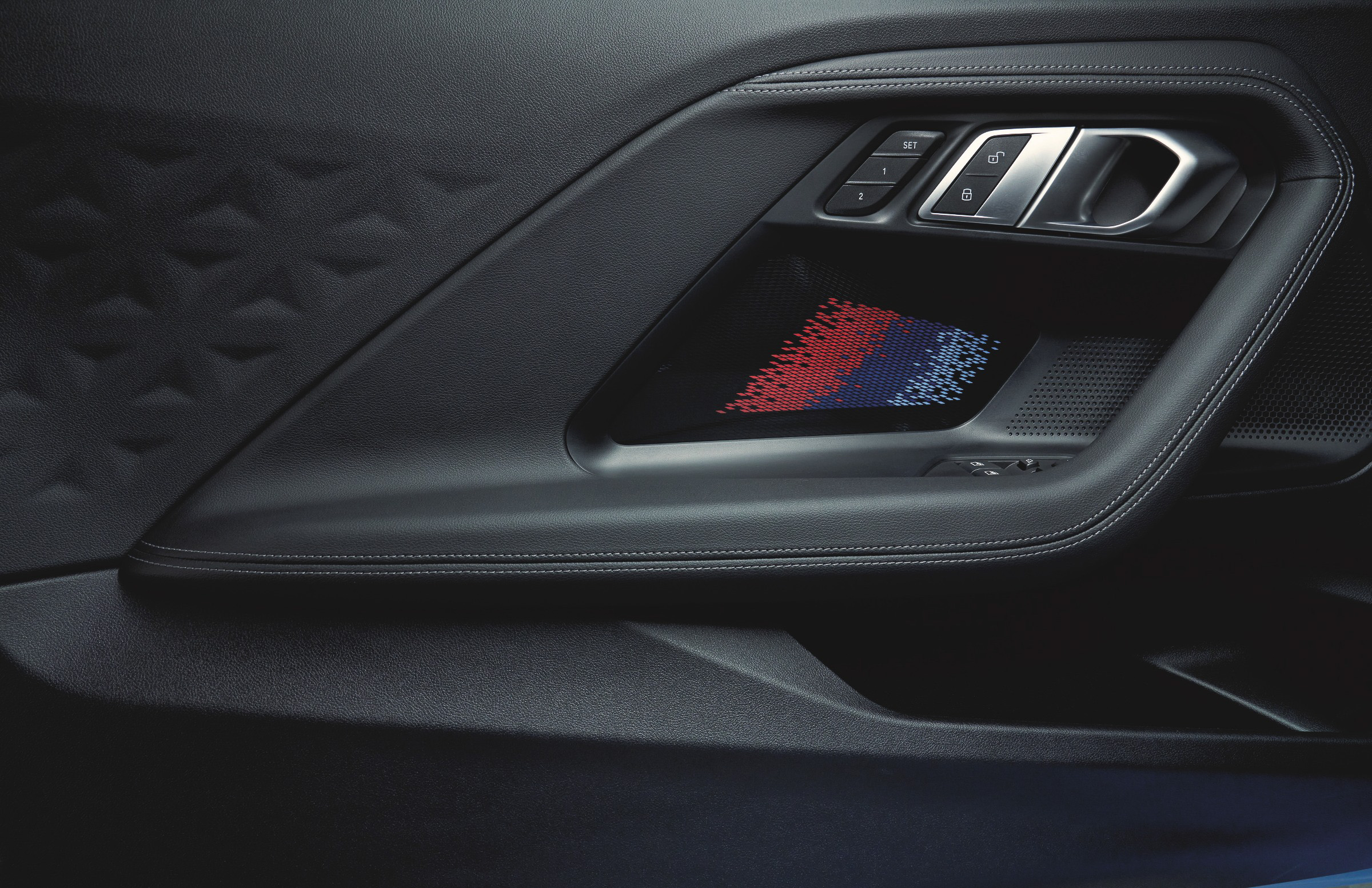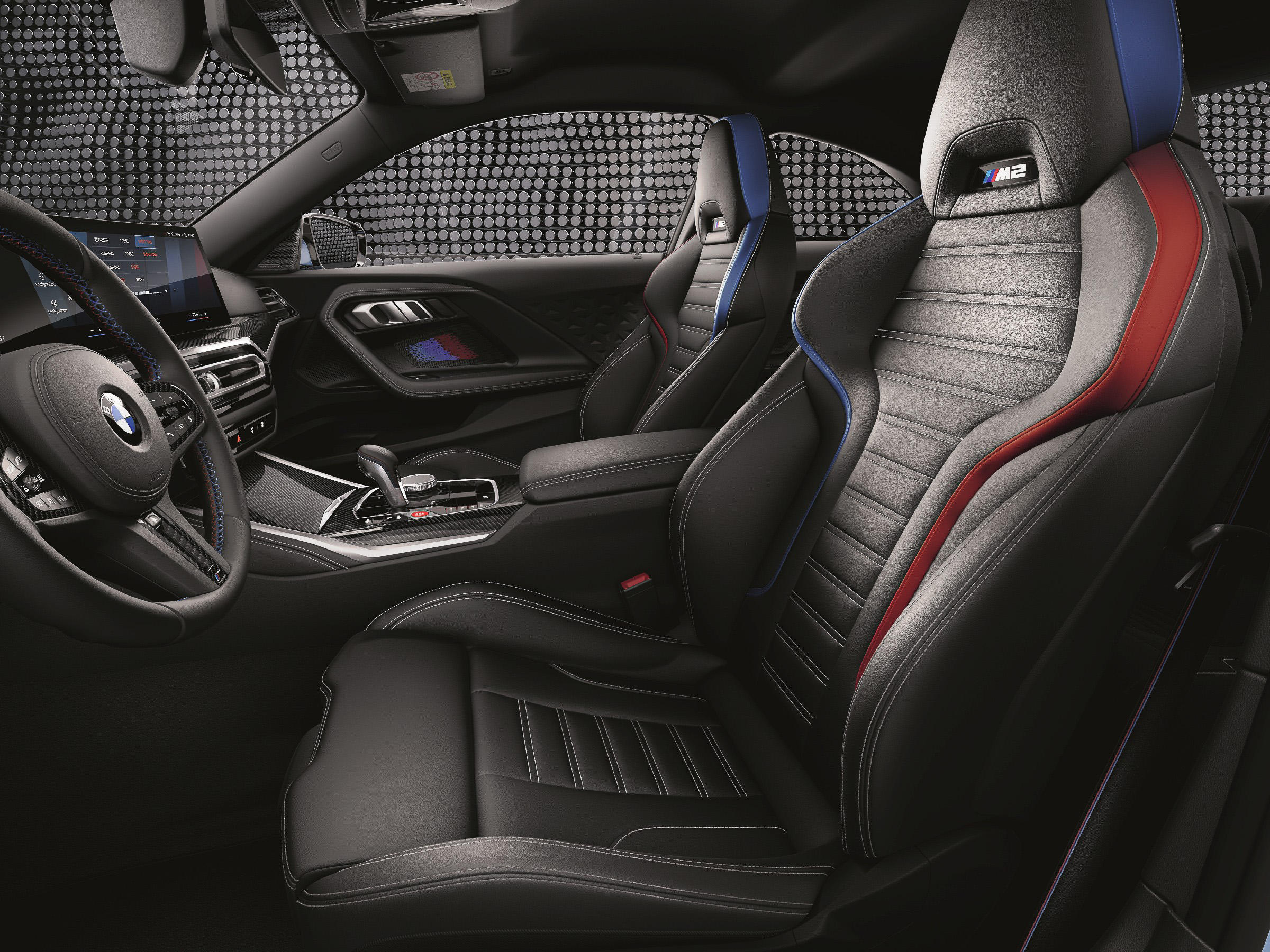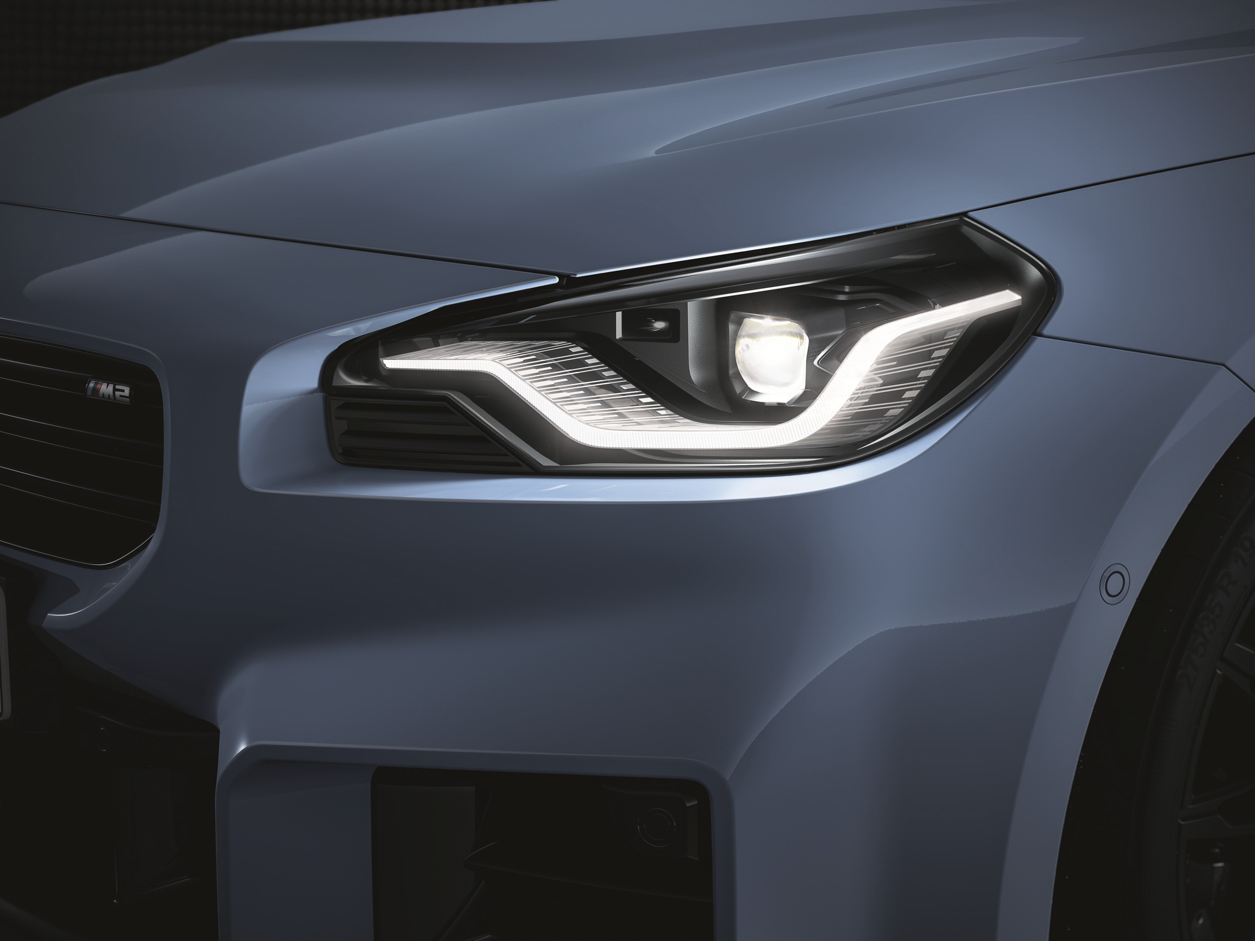 帶著純正M基因的全新世代BMW M2以更運動化且充滿競技肌理線條的暴力美學設計佔領眾人視線,全新專屬BMW M2的雙腎型橫柵式水箱護罩採無邊框設計,搭配大面積的矩形下氣壩與兩側進氣口,充滿賽車跑格且兼具優化空氣力學與冷卻效能設計,是全新世代BMW M2最不容錯認的專屬設計語彙。向經典車款BMW 2002致敬的頭燈造型,同樣以矩形輪廓融合於前保桿設計中,搭配光型變化智慧LED頭燈及遠光燈輔助功能,夜晚中以銳利目光提供駕駛更安全的照明科技。