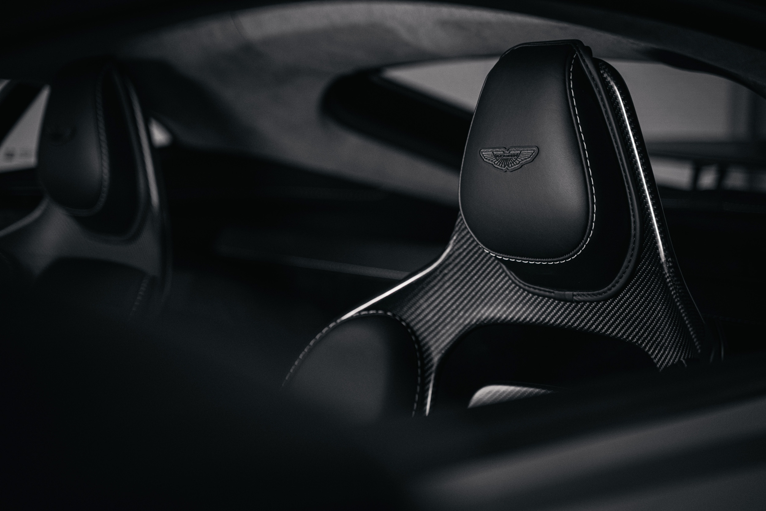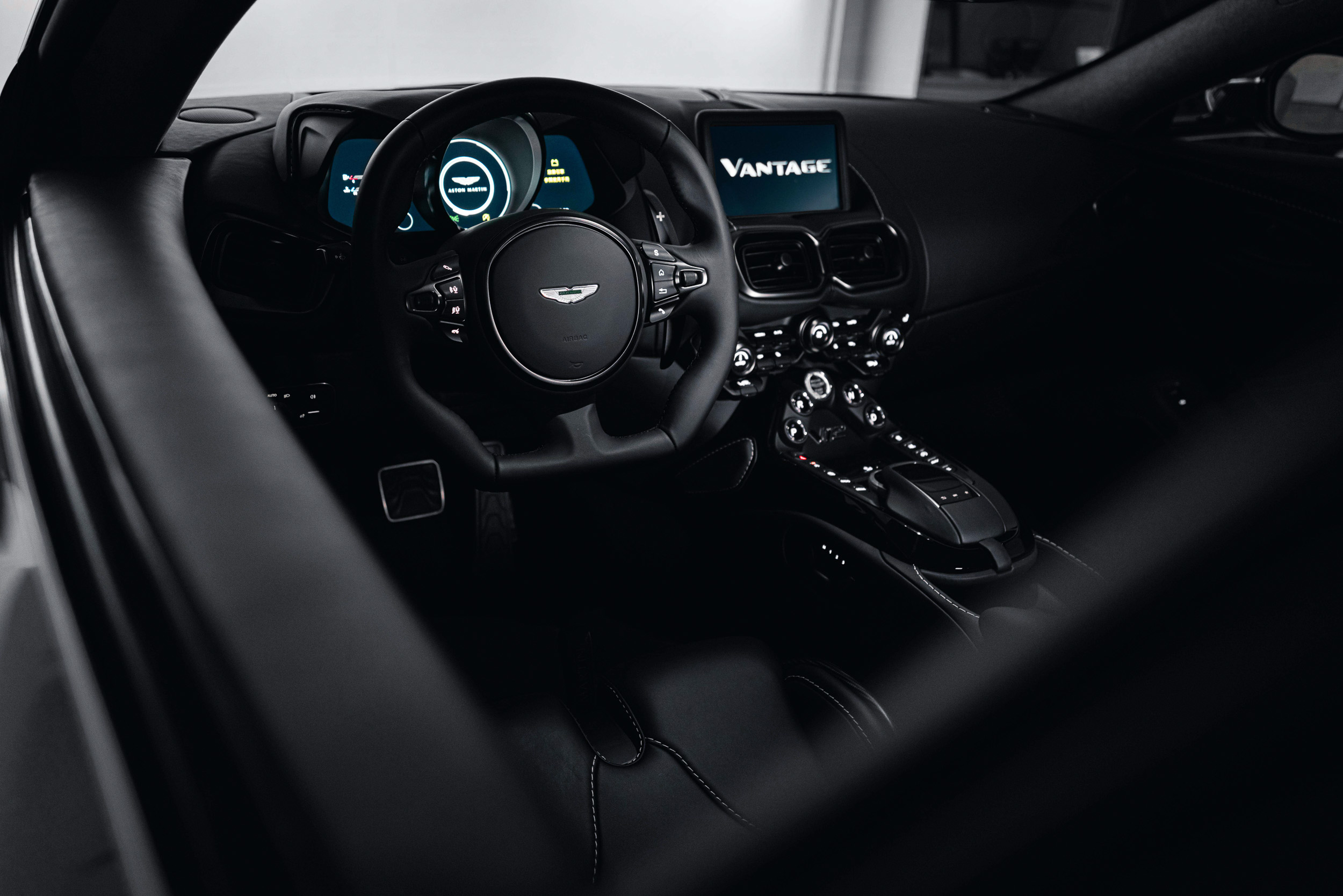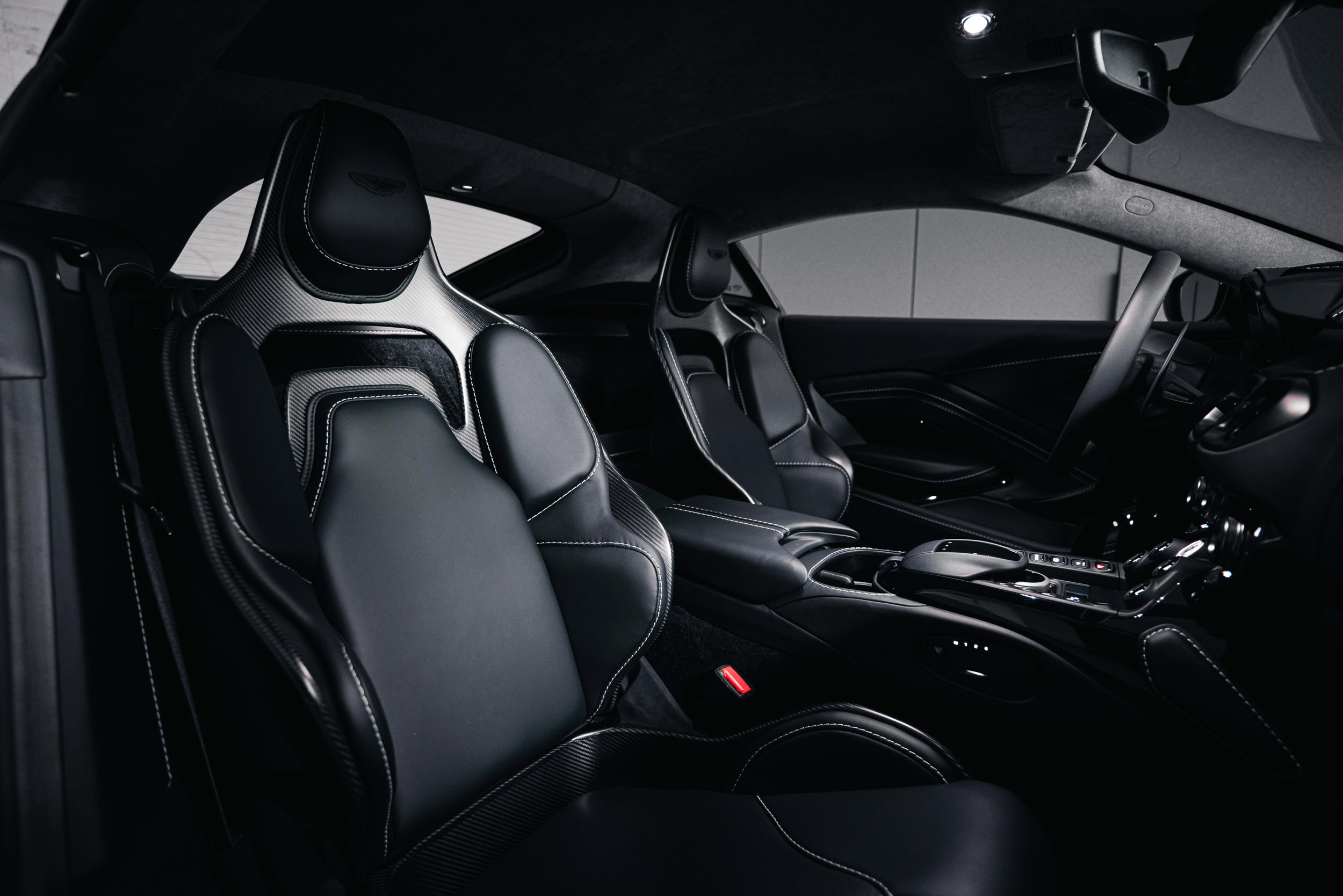 內裝方面,V12 Vantage 保留Vantage車款的經典樣貌標配頂級真皮的 Sports Plus 座椅,並鑲有品牌飛翼徽飾與網孔造型。車主亦可選配全新碳纖維高性能跑車座椅,配備六向調節功能,提供更佳的座椅支撐性。此款跑車座椅為Aston Martin受賽車運動啟發而打造的專利之作,在不影響乘坐舒適性的前提下,可減輕 7.3 公斤座椅重量。