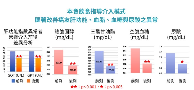 二、身體檢查指數:介入前超過10%癌友有肝功能指數異常、近30%有高膽固醇血症、近15%高三酸甘油酯、近25%飯前血糖異常、近10%尿酸高。經三個月的指導介入後,以上項目都有顯著改善,且癌症治療常造成的白血球與紅血球低下,在飲食指導介入後也有明顯改善。