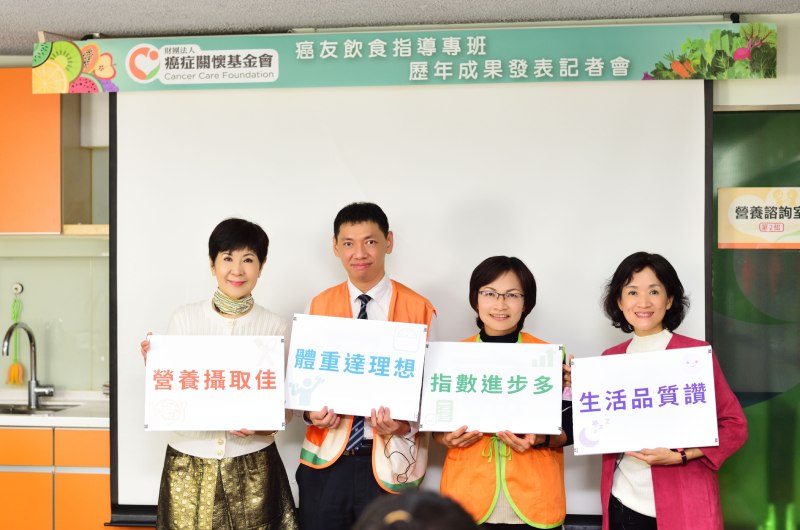 接受飲食指導的癌友也分享到,年輕時常常從早上8點一直工作到凌晨2點,覺得食物只要能吃飽就好,而且都以外食居多,在7年前發現已腦癌四期,腫瘤大約有3.5公分,經過化療、放療都沒有效果,但在經過飲食指導後腫瘤逐漸消失,也讓他懂得如何自我照顧。癌症關懷基金會董事長陳月卿也呼籲,罹癌不可怕,基金會規劃設計的「癌友飲食指導專班」改變癌友飲食、生活方式、思維方式並讓癌友感受到愛與關懷,希望能有效幫助民眾抗癌防癌,而且飲食指導經醫學統計分析證實有效,希望癌友不要放棄,一起努力,找回生命的美好。