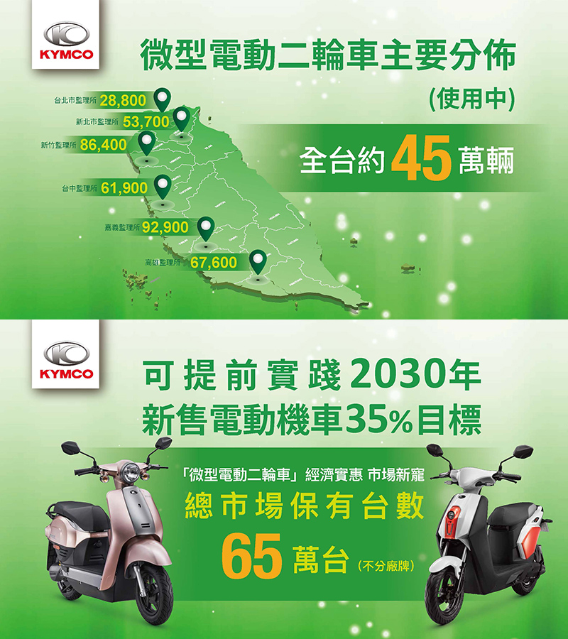 根據統計,全台微型電動二輪車總保有台數約65萬台、使用中車輛則預估約45萬輛,經濟、實惠、簡單、輕盈等特性讓微型電動二輪車成為市場新寵!而國發會日前公布台灣淨零轉型四大策略、兩大基礎中,提及為減少運輸部門的碳排放,更規劃電動機車新車銷售量於2030年達到35% 的目標。如果依照Kymco執行長柯俊斌所積極倡議,將微型電動二輪車納入電動機車範疇,同時比照電動機車提供相對應的購車補助力道,相信對於微型電動二輪車的銷售力道勢必增強,不僅可提前實踐2030年達新售電動機車35%的目標,更可加速達成2040 年電動機車新車市售佔比 100% 遠程目標。
