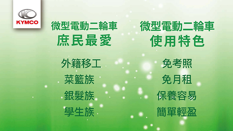 以台灣用車環境而論,微型電動二輪車因擁有免考照、免月租、保養容易及簡單輕盈等多項優勢,近年來成長相當迅速,而當由Kymco帶頭推動的微型電動二輪車修法條例實施後,相信更是包含學生、外籍移工、銀髮族與菜籃族等短程騎乘的最佳選擇。