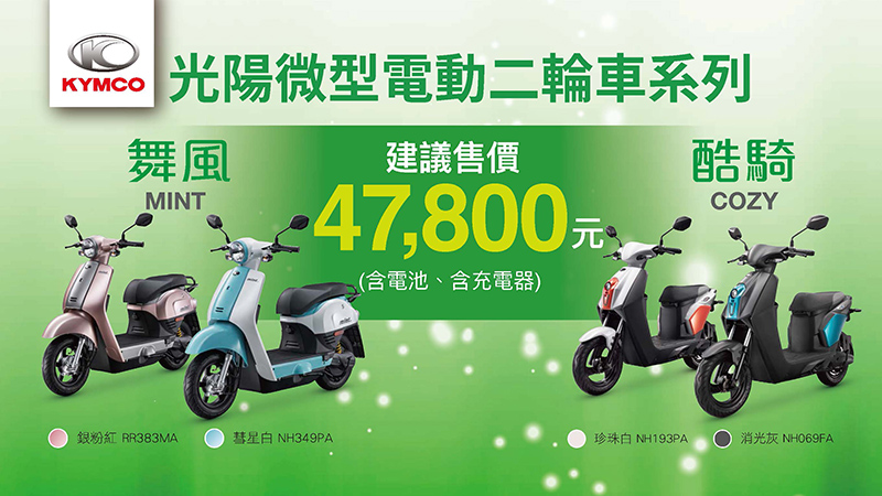 「舞風Mint」與「酷騎Cozy」建議售價同為47,800元,售價皆包含電池與充電器等配備,邀請消費者一騎「免考照,自由騎」、「免月租,無負擔」成市場新寵!為倡議政府能積極將微型電動二輪車納入電動機車範疇、推出購車補助,Kymco也率先推出「大有可微 333優惠方案」,包含3千元購車金、3人揪團每人再折2千元、3台 (含) 公司行號每台再特惠2千元,購車最高優惠5,000元,絕對是當前業界最佳微型電動二輪車的購買優惠!Kymco也期望藉此達到拋磚引玉之效,讓政府一起加入補助購車行列,一起為台灣電動機車普及率而努力!