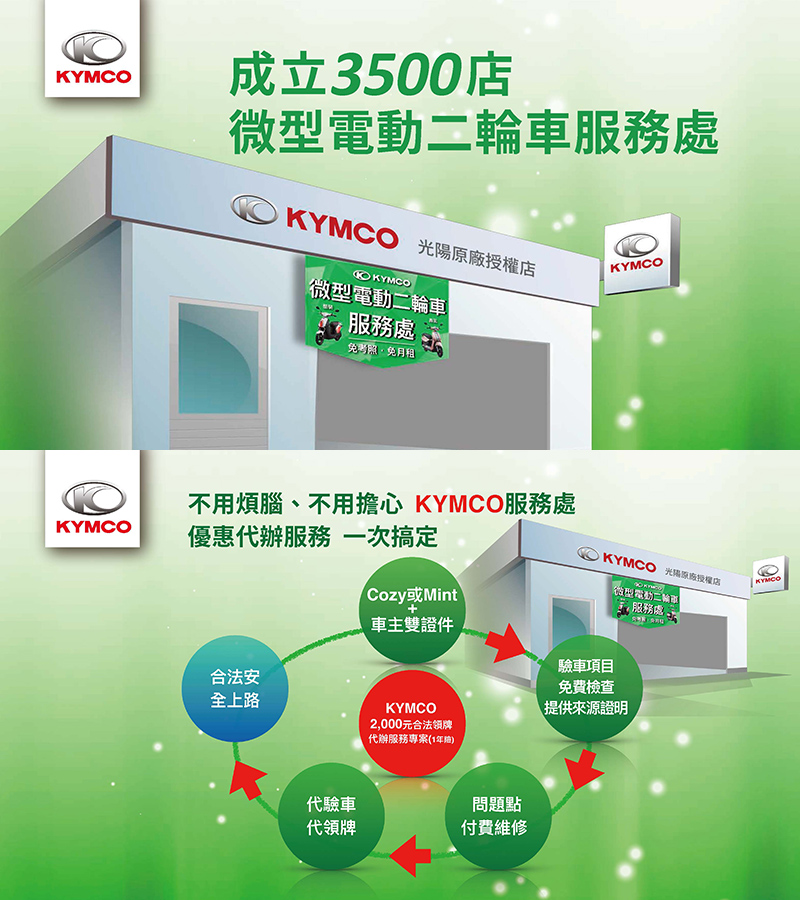 - 光陽成立3,500微型電動二輪車服務處,更有500家以上代銷商提供掛牌諮詢的免費服務。