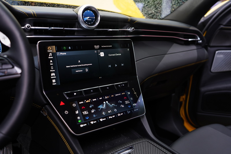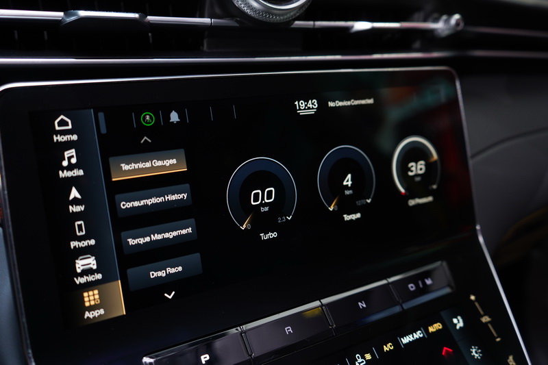 兼具未來科技風格與傳統義式工藝的座艙鋪陳,全新Grecale巧妙運用天然皮革、碳纖維、木材等料件與獨特色彩搭配所譜出的和諧義式氛圍為基底,結合由12.3吋馬鞍型數位儀錶、12.3吋及8.8吋雙螢幕中央控制面板、Maserati智能時鐘所構成的四大數位化顯示區域,帶來更加豐富多變的行車資訊與直覺便利的使用體驗。全新Grecale更取消傳統排檔桿設計,簡約地整合於中控介面並採用按鍵式操作,駕駛人亦可隨時利用方向盤後方的鋁質換檔撥片享受隨傳隨到的動力快感。全新Grecale在流線動感的外觀設計下,可提供同級最大的車室與行李廂空間,確保每一趟旅程都舒適愜意,同時搭配全車系標配的14支義大利Sonus faber頂級揚聲器、後座獨立6.5吋控制螢幕的三區恆溫空調系統,以及Modean、Trofeo 車型可隨行車模式自動變換白、紅、黃(Trofeo車型專屬)不同背光照明的環艙氛圍燈等豪華便利配備,一登入車室即可沉浸於無可比擬的義式奢華享受之中。