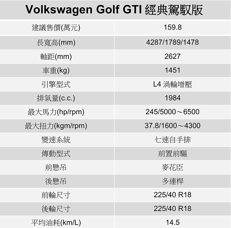 Volkswagen八代Golf GTI動力輸出雖沒進行調漲,但VDM車輛動態管理系統與VAQ限滑差速器讓八代Golf GTI擁有更俐落出色的動態表現,而之前Volkswagen推出Golf GTI經典駕馭版,不僅配置象徵GTI的格紋跑車型座椅還加配備,重點售價還更便宜。
